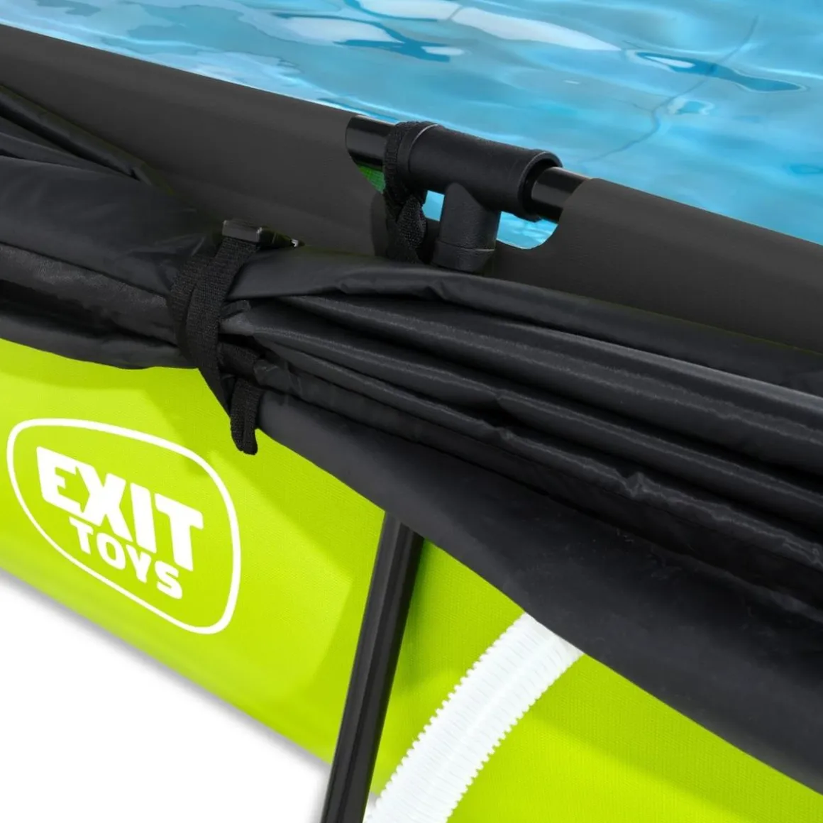 El toldo único de EXIT Toys ofrece una protección óptima contra el sol. Gracias al mecanismo de plegado fácil de usar, creará sombra parcial o total en la piscina en poco tiempo, de modo que incluso cuando el sol está realmente alto, podrás nadar sin problemas. Las bandas ajustables permiten mover el toldo según la posición del sol y asegurarlo a cualquier altura deseada. El toldo tiene un elegante diseño negro con un acabado de alta calidad.