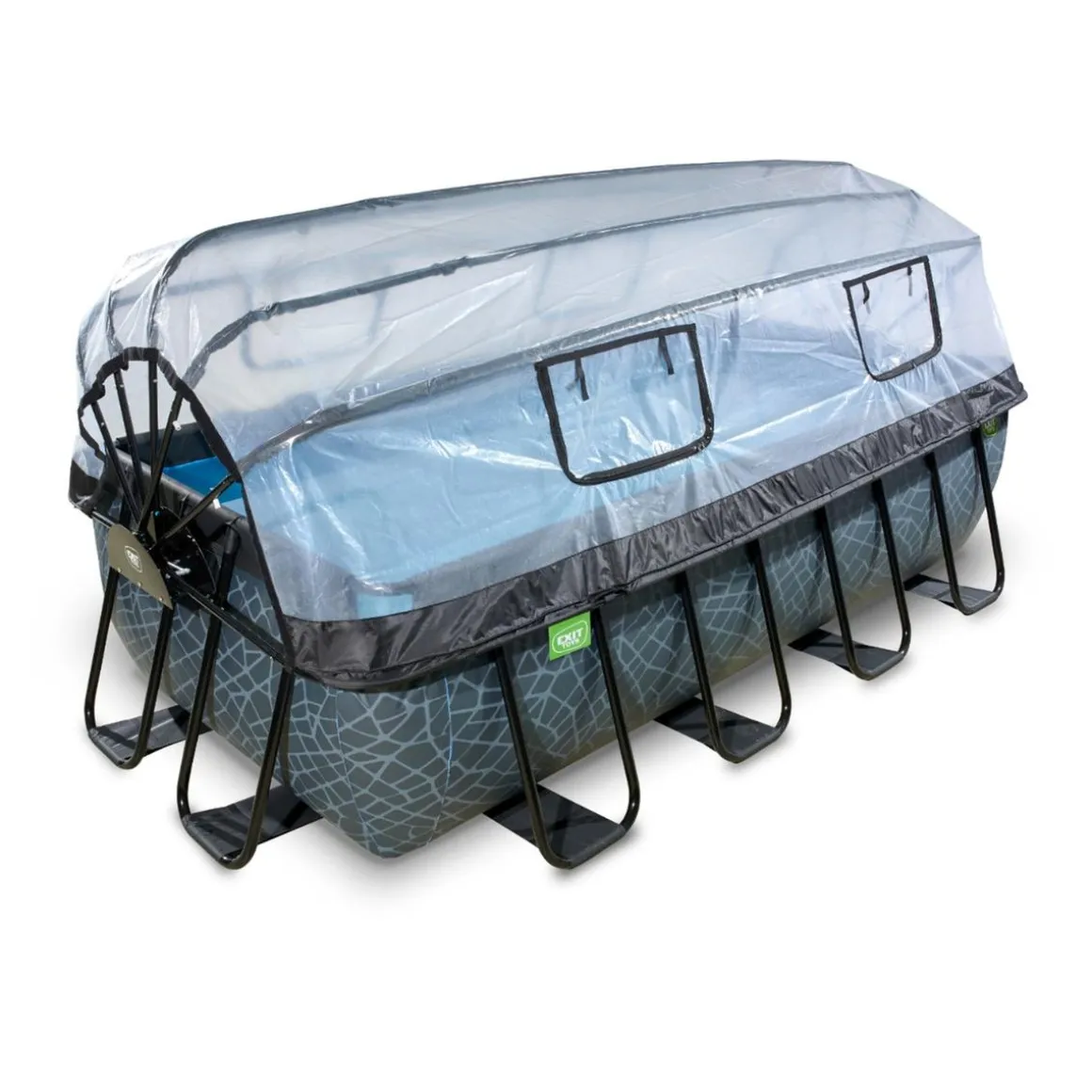 Exit – Piscina Stone gris 400 x 200 x 100 cm con filtro de arena y cúpula, una piscina rectangular con efecto piedra de color gris con cúpula.