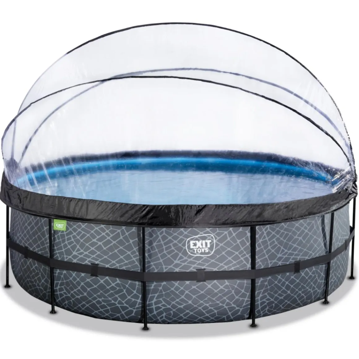 Exit – Piscina Stone gris diámetro 450 x 122 cm con filtro de arena y cúpula, una piscina redonda con efecto piedra de color gris y con cúpula.