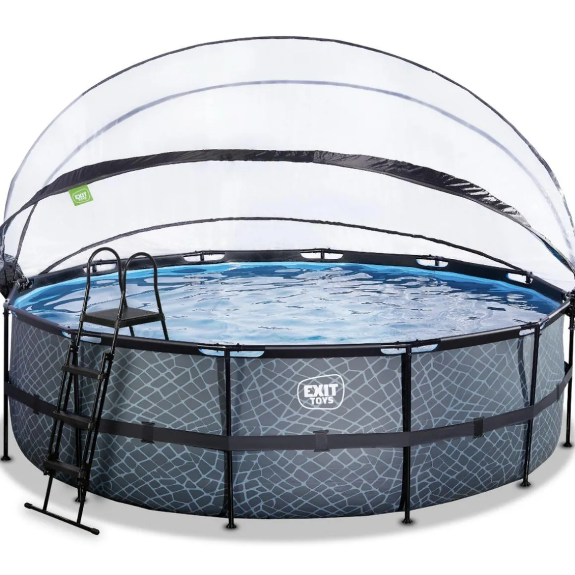 Exit – Piscina Stone gris diámetro 488 x 122 cm con filtro de arena y cúpula, una piscina redonda con efecto piedra de color gris y con cúpula.