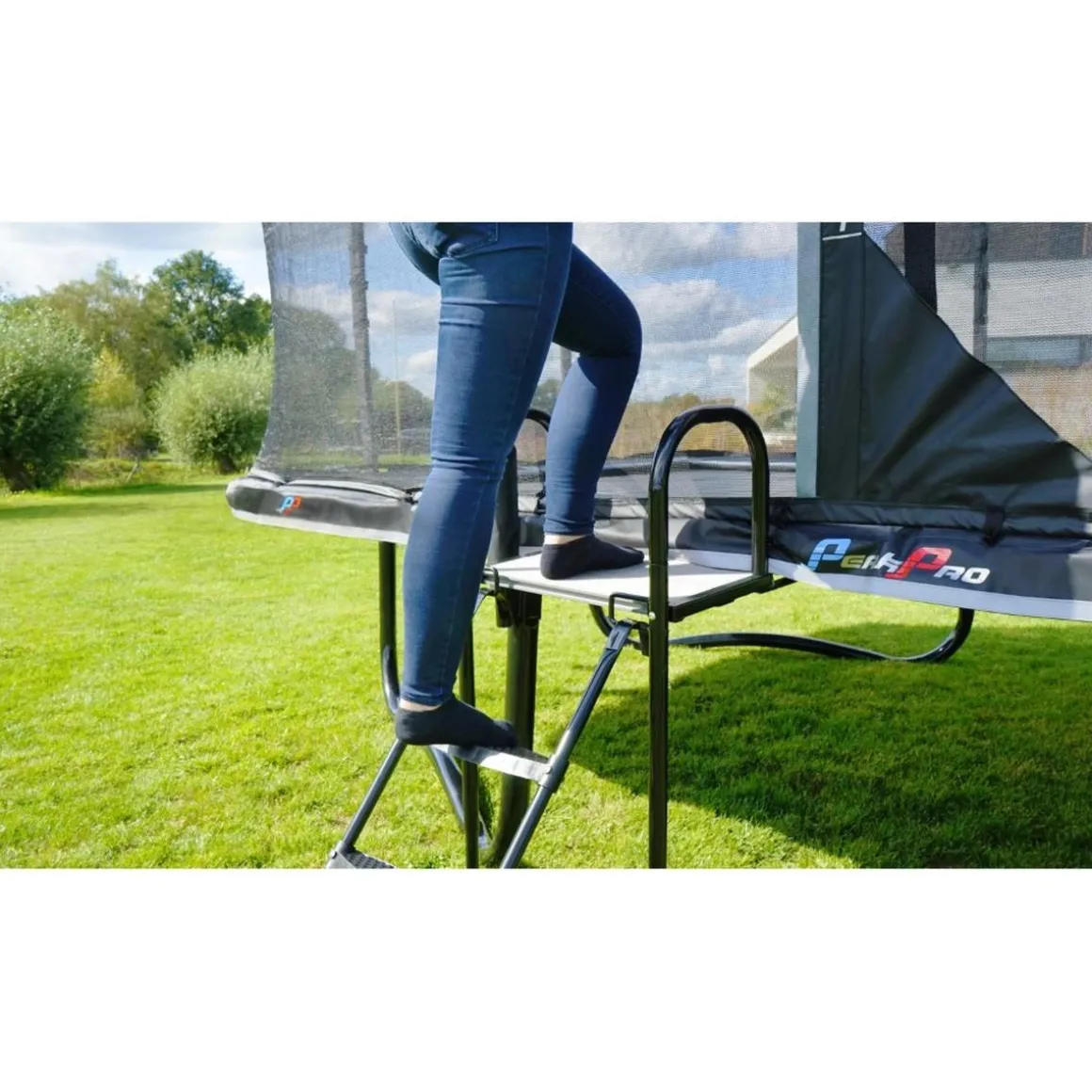 La plataforma de trampolín es un accesorio adicional para ayudarte a subir a un trampolín con escalera de manera segura y sin esfuerzo.