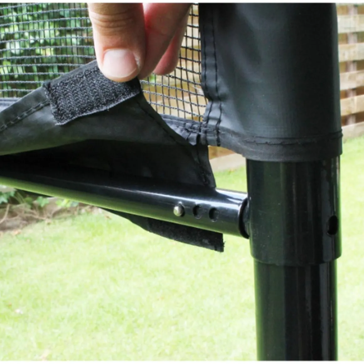 ¿La red te molesta cuando quieres cortar el césped? Puede levantar fácilmente la red de los anclajes y colocarla en otro lugar. Un sistema de doble apriete asegura que la red esté siempre tensa.