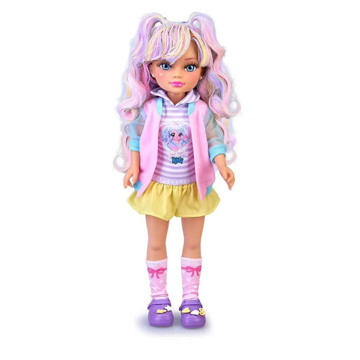 - Un look kawaii que roba corazones: Nancy luce una falda de tablas con vuelo, sudadera súper cool, chaleco rosa y calcetines hasta la rodilla. ¡El conjunto perfecto para marcar tendencia en el patio o en casa!