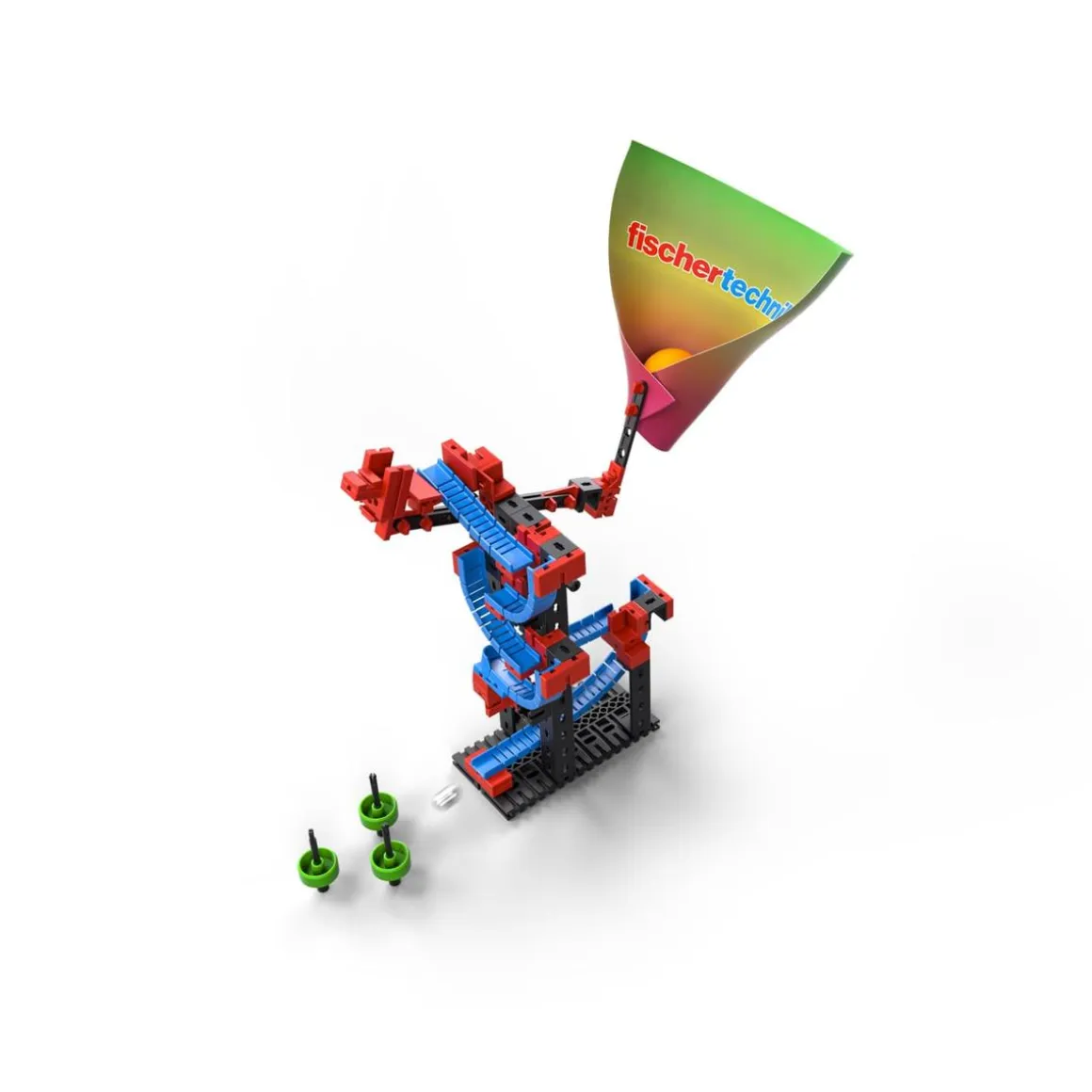Fischer Technik – Ping Pong Bowling. El juego combinado de habilidad y un poco de suerte. En primer lugar, se trata de apuntar con precisión y realizar un buen lanzamiento. Cuando la pelota de ping-pong cae en el embudo, se inicia la pista de bolas, al final de la cual los conos esperan a ser derribados. ¿Quién consigue golpear más conos?