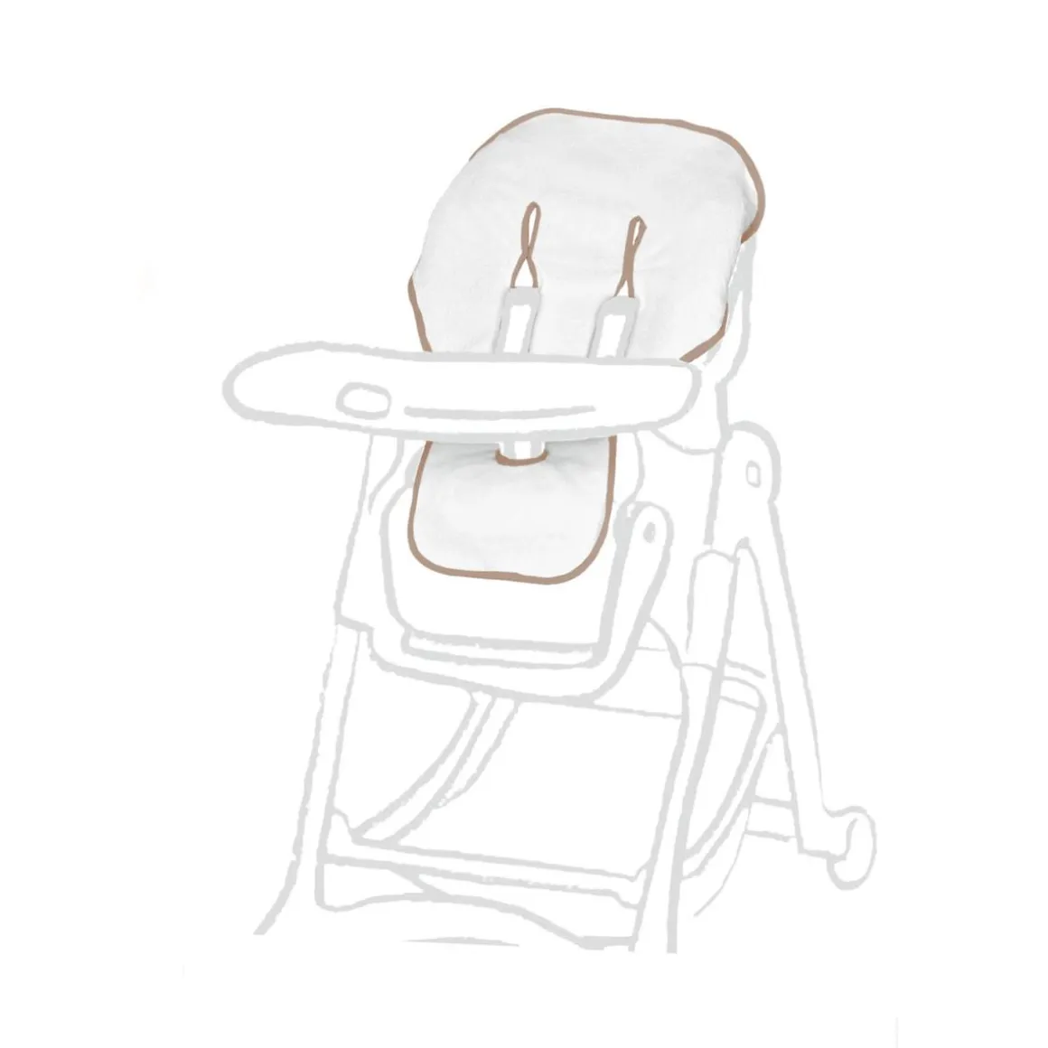 Sus medidas aproximadas de 50×90 cm permiten adaptarla a la mayoría de sillas altas y tronas estándar. Incorpora ojales para pasar los arneses de seguridad y una práctica zona trasera que ayuda a fijarla mejor al asiento. El vivo o borde en tejido gris/tórtola añade un detalle decorativo discreto que combina fácilmente con distintos modelos de trona y con el resto de la cocina o zona de comedor.
