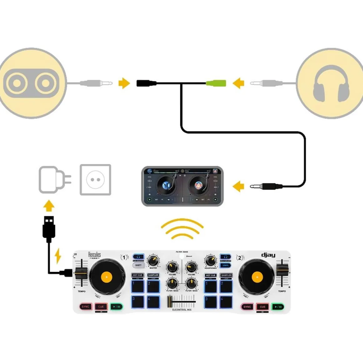 - Cable divisor de DJ (incluido) conectado a la toma de auriculares del smartphone/tableta: