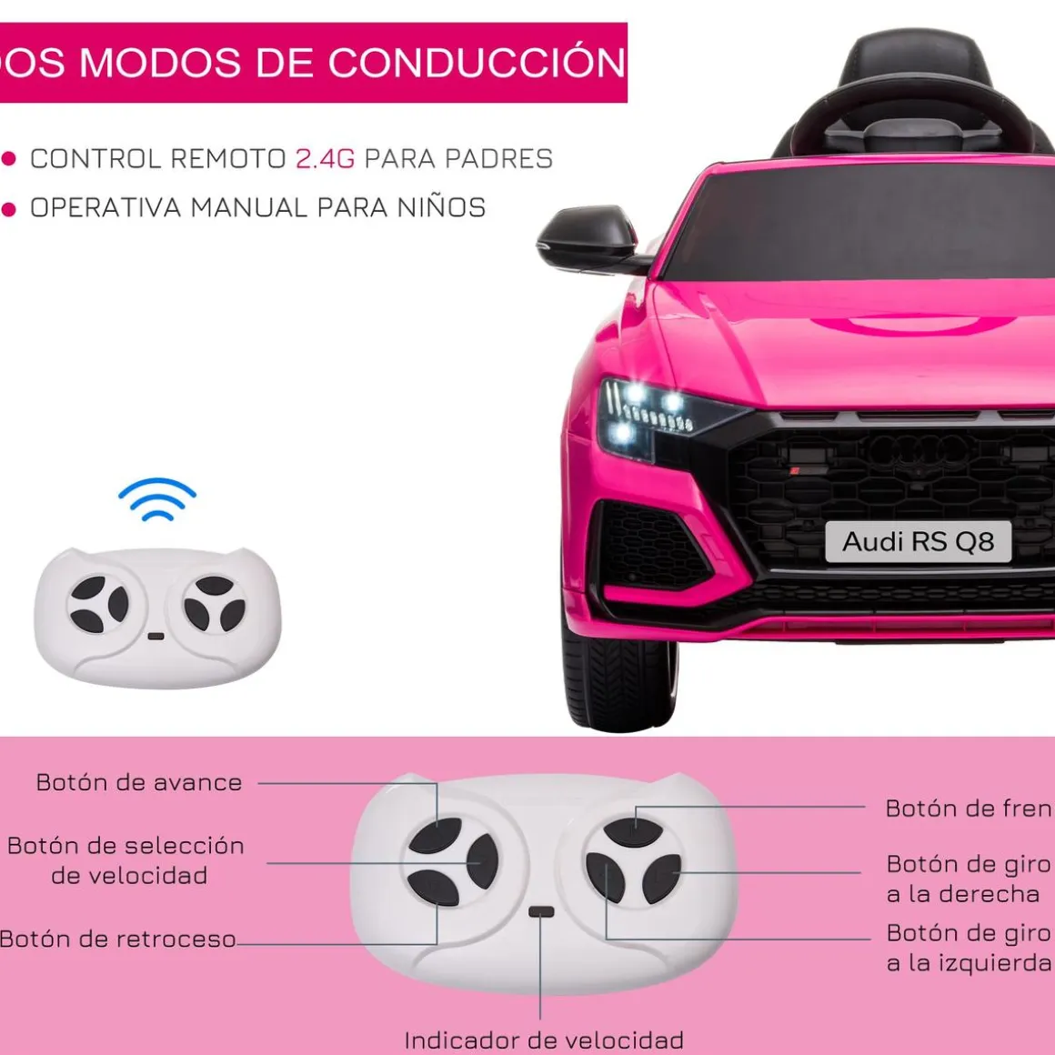 - Control remoto 2,4 G para que los padres o cualquier adulto responsable pueda conducir el vehículo a distancia para mayor seguridad.