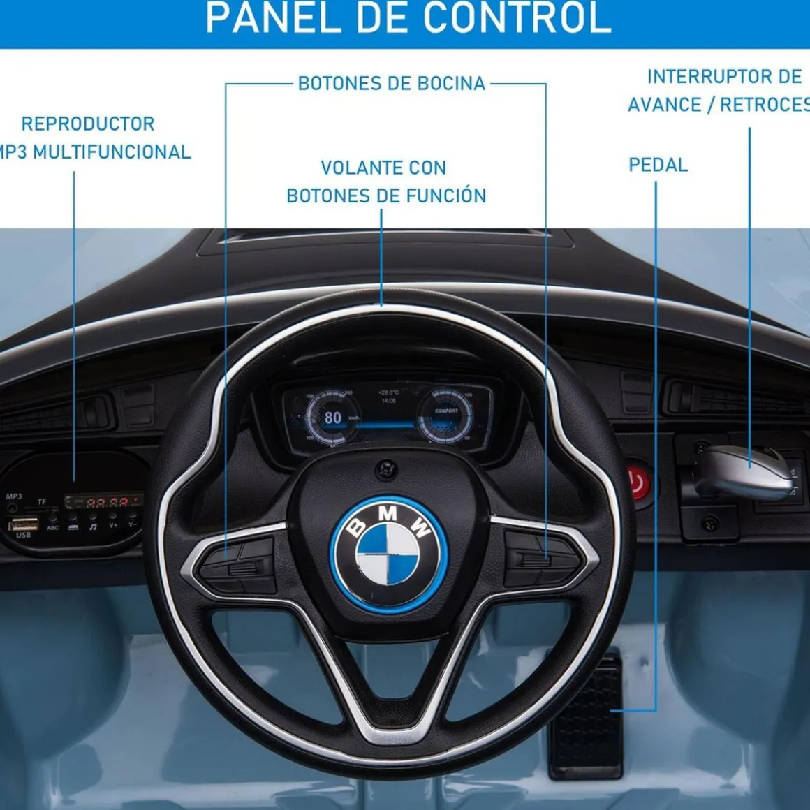 - BMW I8 COUPE con licencia de la marca. Su aspecto realista, la bocina, la música, los faros brillantes, su diseño aerodinámico y sus 2 puertas encantarán a toda la familia.