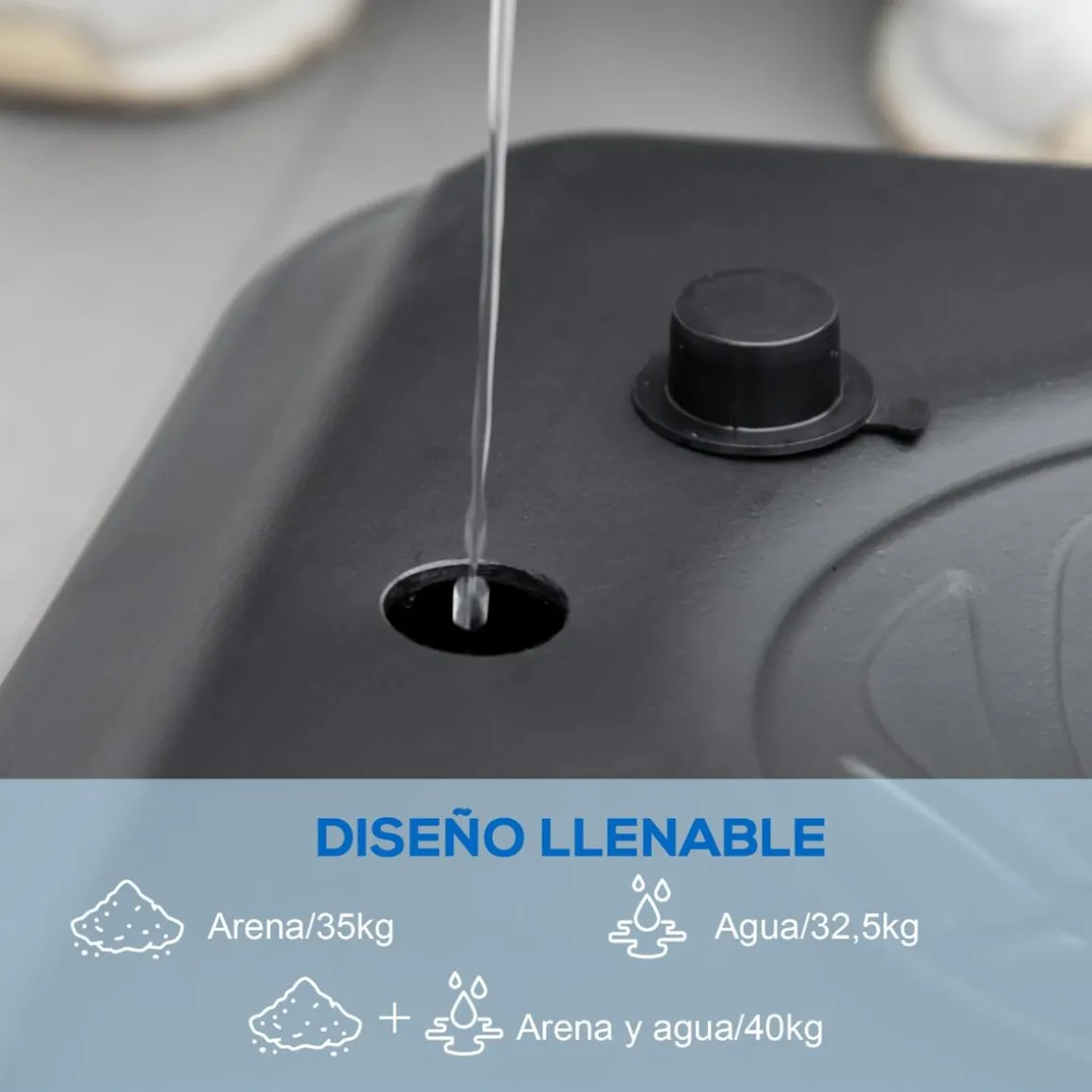 - La base ampliada con estructura triangular se puede llenar con agua, arena o una combinación para mayor estabilidad.