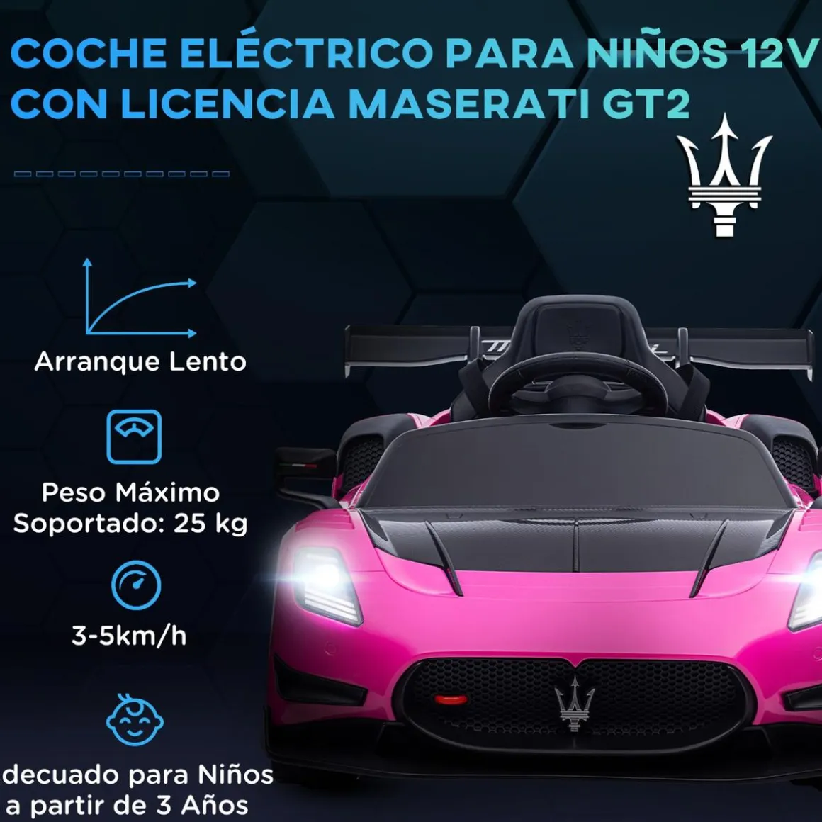 Homcom – Maserati GT2 eléctrico Rosa con mando, con la licencia oficial del Maserati GT2 que garantiza que el diseño y los detalles son fieles al modelo real de la marca. Ofrece a los niños una experiencia de conducción auténtica y emocionante.