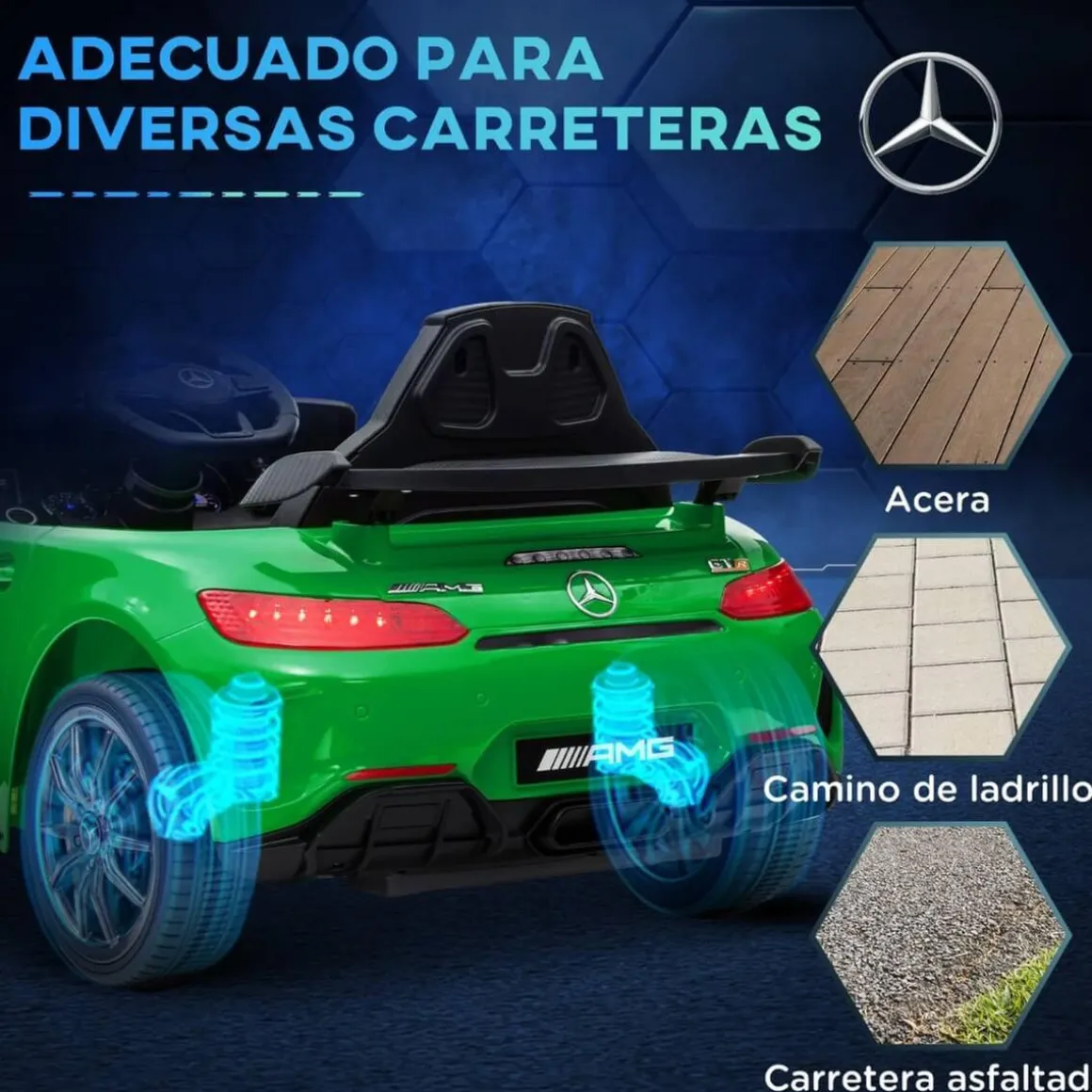 Homcom – Mercedes Benz AMG GTR eléctrico Verde con mando, un coche para niños que combina elegancia y funcionalidad, ofreciendo una experiencia de conducción realista y emocionante para los pequeños pilotos.
