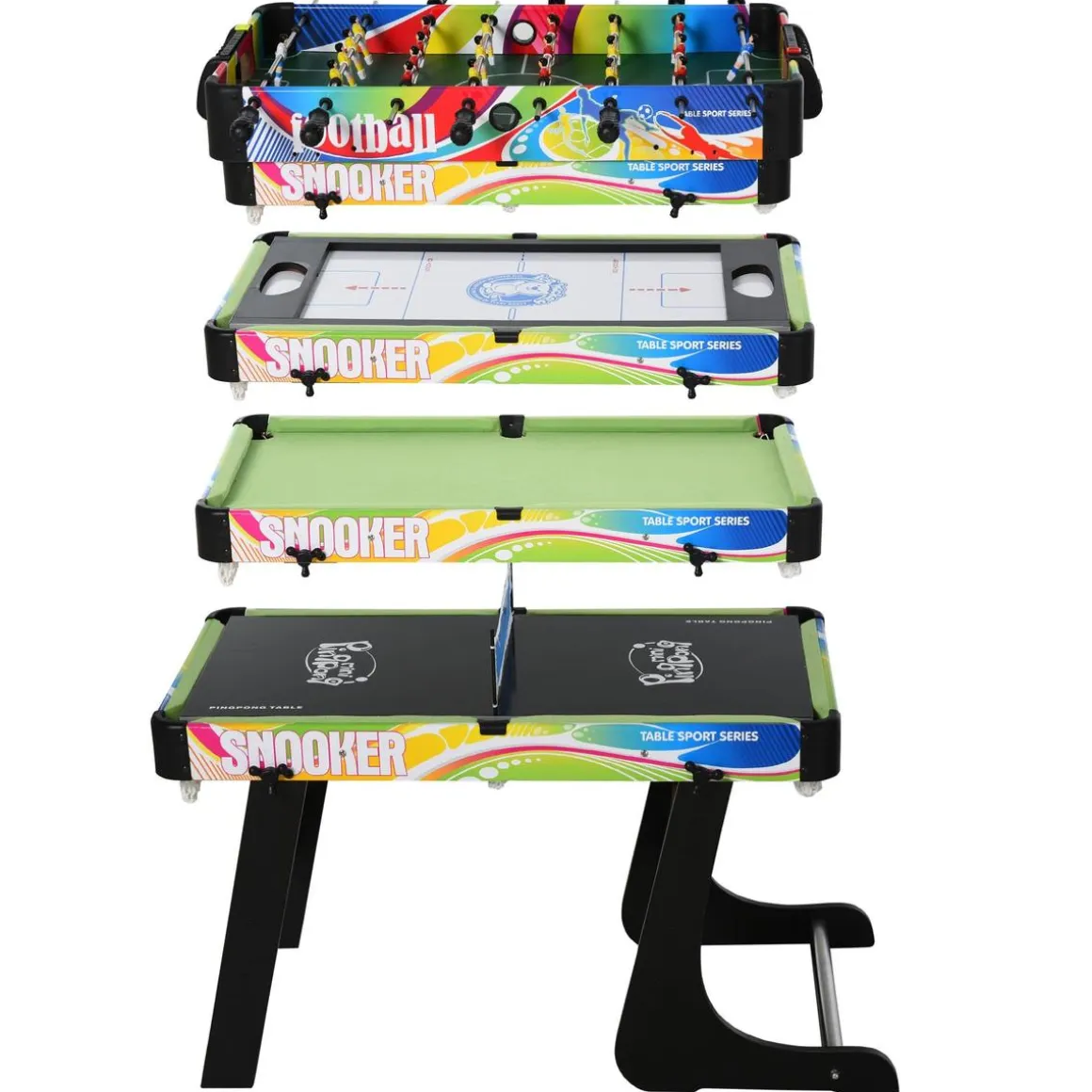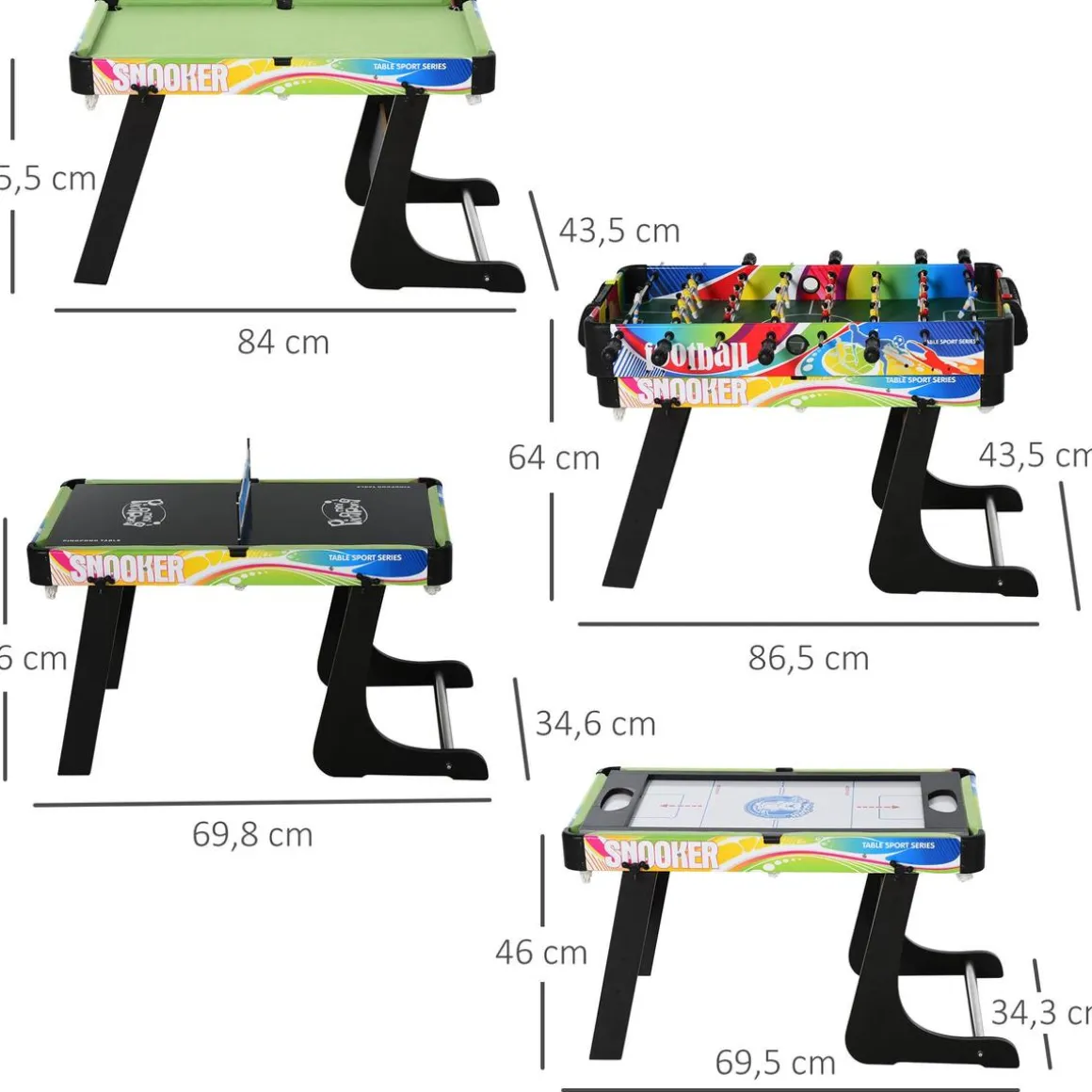 Incluye todo lo necesario para jugar, como raquetas y bolas, palo de billar y bolas, pelotas del futbolín, discos y empujadores de hockey, etc. Dimensiones: Mesa de fútbol 86,5 x 43,5 x 64 cm; billar 84 x 43,5 x 45,5 cm; mesa de hockey 69,5 x 34,3 x 46 cm; mesa de ping-pong 69,8 x 34,6 x 46 cm.
