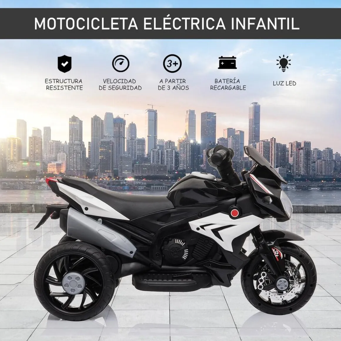Homcom – Moto eléctrica batería 3 ruedas Trimoto Negro y Blanco. ¡Qué empiece la aventura! Esta motocicleta eléctrica de Homcom con 3 ruedas será la compañera de aventuras perfecta para cualquier niño. Con una autonomía de hasta 45 minutos después de una carga completa, podrá ir por sus lugares favoritos como un verdadero conductor y a una velocidad limitada de seguridad de 3 km/h. Con faros delanteros con luz, esta moto ofrece una experiencia de conducción de lo más realista, para que los niños se lo pasen en grande.