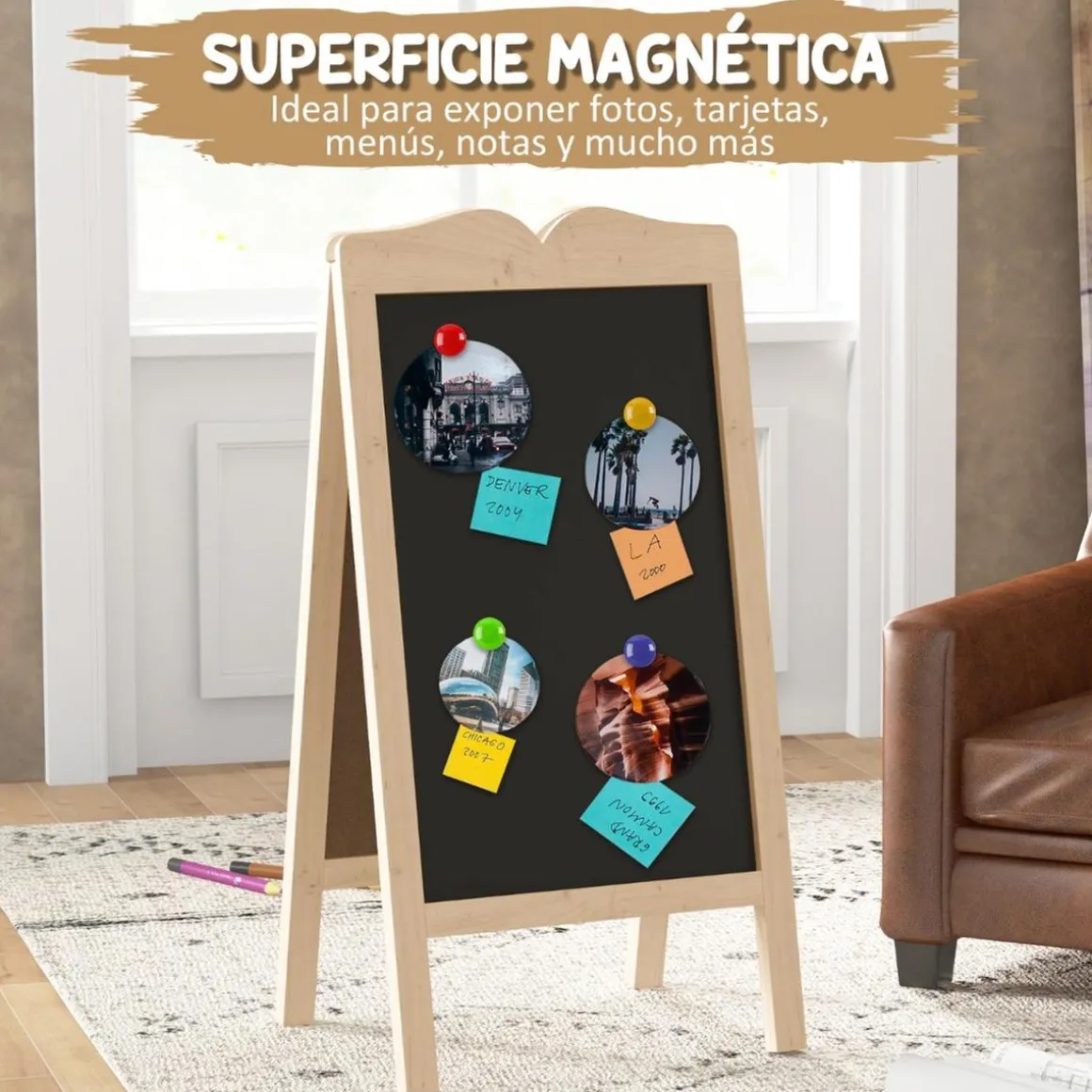 Además, cuenta con una superficie magnética ideal para colocar imanes con notas, mostrar fotos, etc. Gracias a su estructura de madera de abeto y su diseño en forma de A, es resistente y estable. Y lo mejor de todo es que es plegable para poder guardar y mover cómodamente.