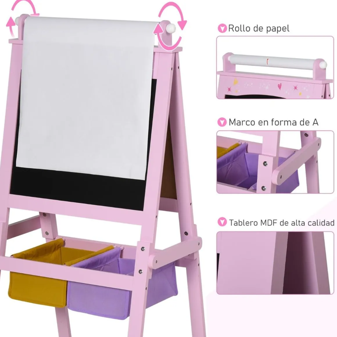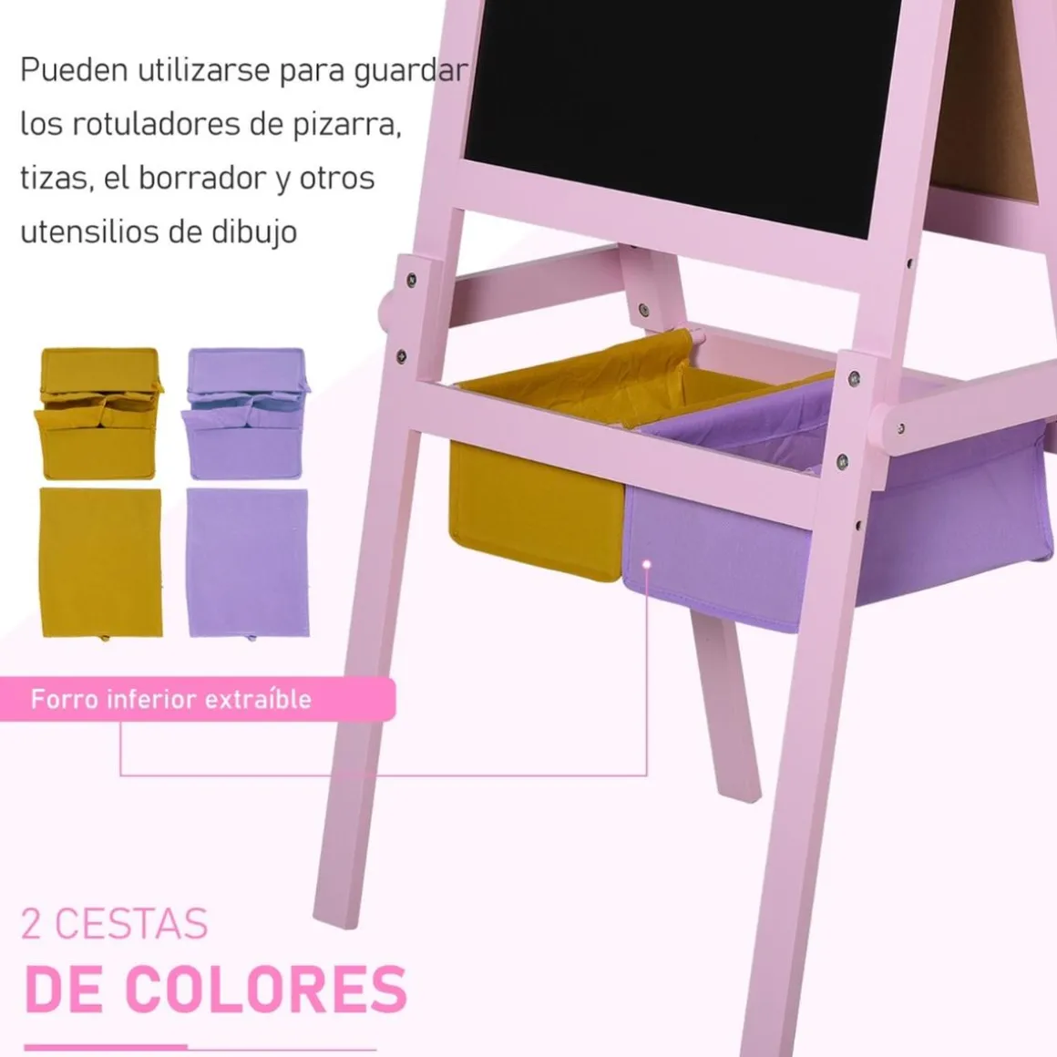 Homcom – Pizarra infantil 3 en 1 con caballete. Este caballete de pizarra es como un sueño hecho realidad para cualquier niño: ¡Tres pizarras en una! Proporciona un espacio creativo donde los niños pueden escribir y dibujar con tizas, rotuladores o papel, transformando el aprendizaje en una experiencia lúdica. Además, incluye dos cestas en la parte inferior para mantener ordenados todos los accesorios de dibujo.
