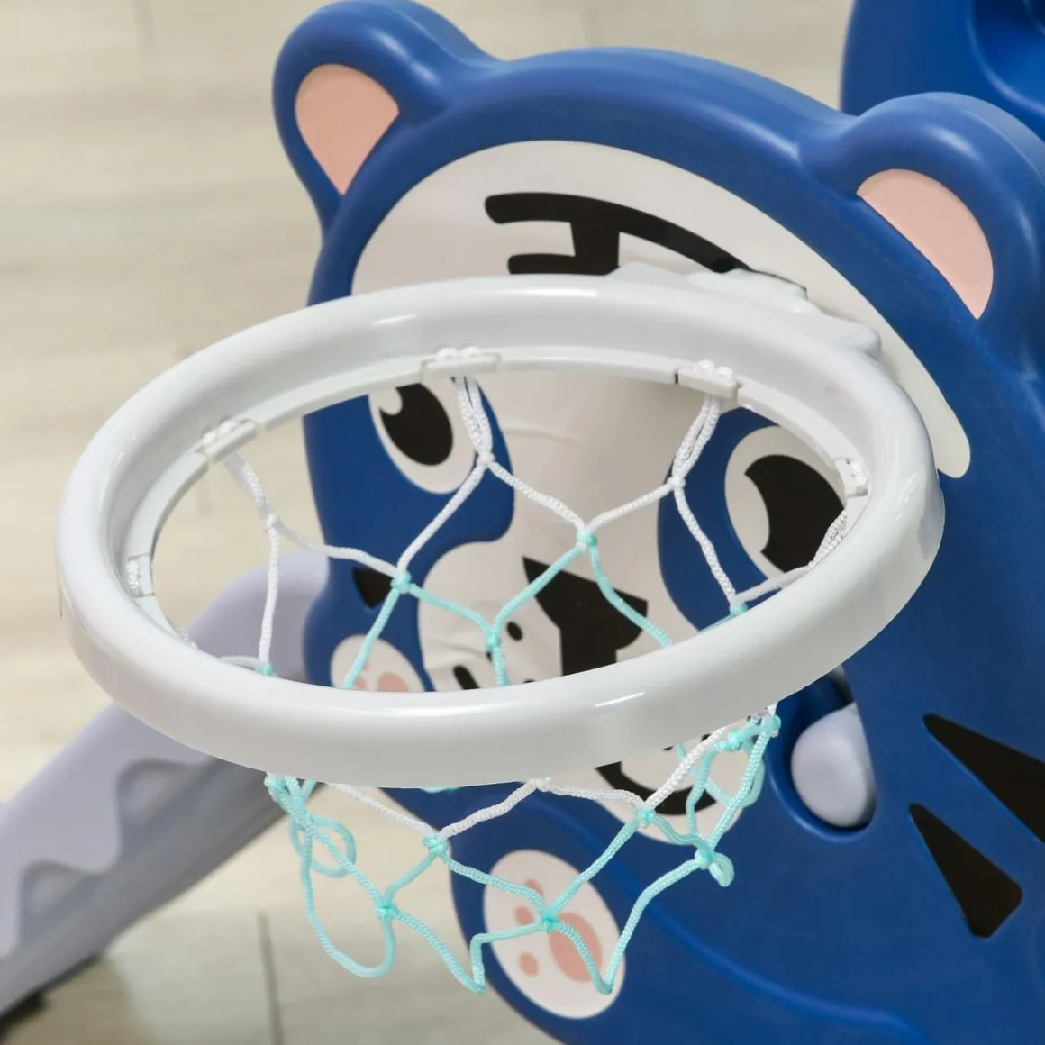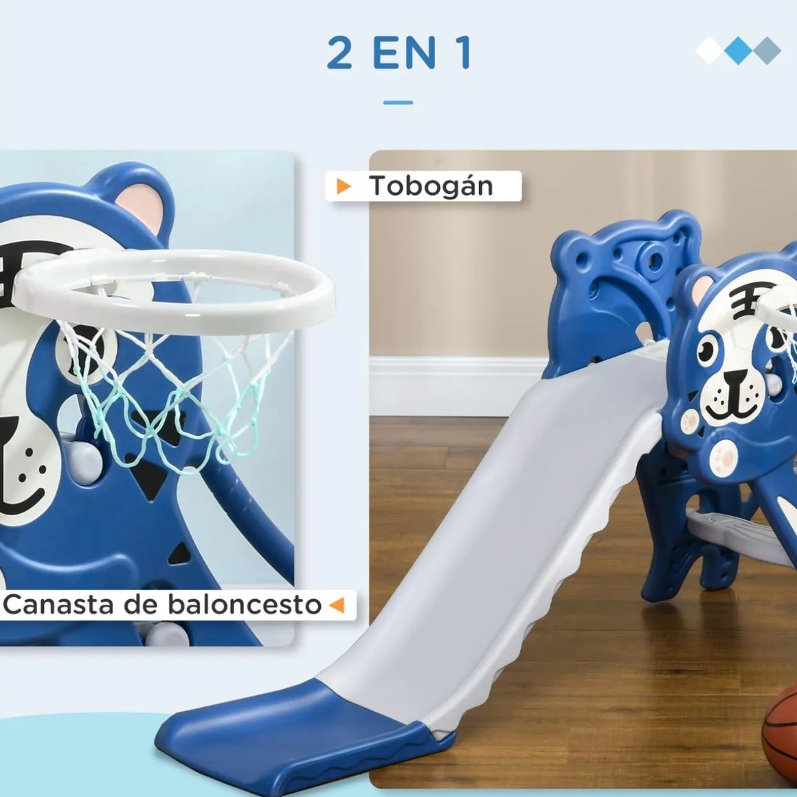 Homcom – Tobogán de interior Tigre. Diseñado para proporcionar horas de diversión, este tobogán para niños cuenta con 2 escaleras antideslizantes para garantizar a los más pequeños un apoyo seguro y una estructura confiable. El tobogán también cuenta con una canasta de baloncesto montada lateralmente para que los niños se diviertan de varias maneras con la misma estructura. Gracias a los adorables dibujos del tigre, este tobogán infantil de interior añadirá un toque juguetón a los espacios de juego de los más pequeños.