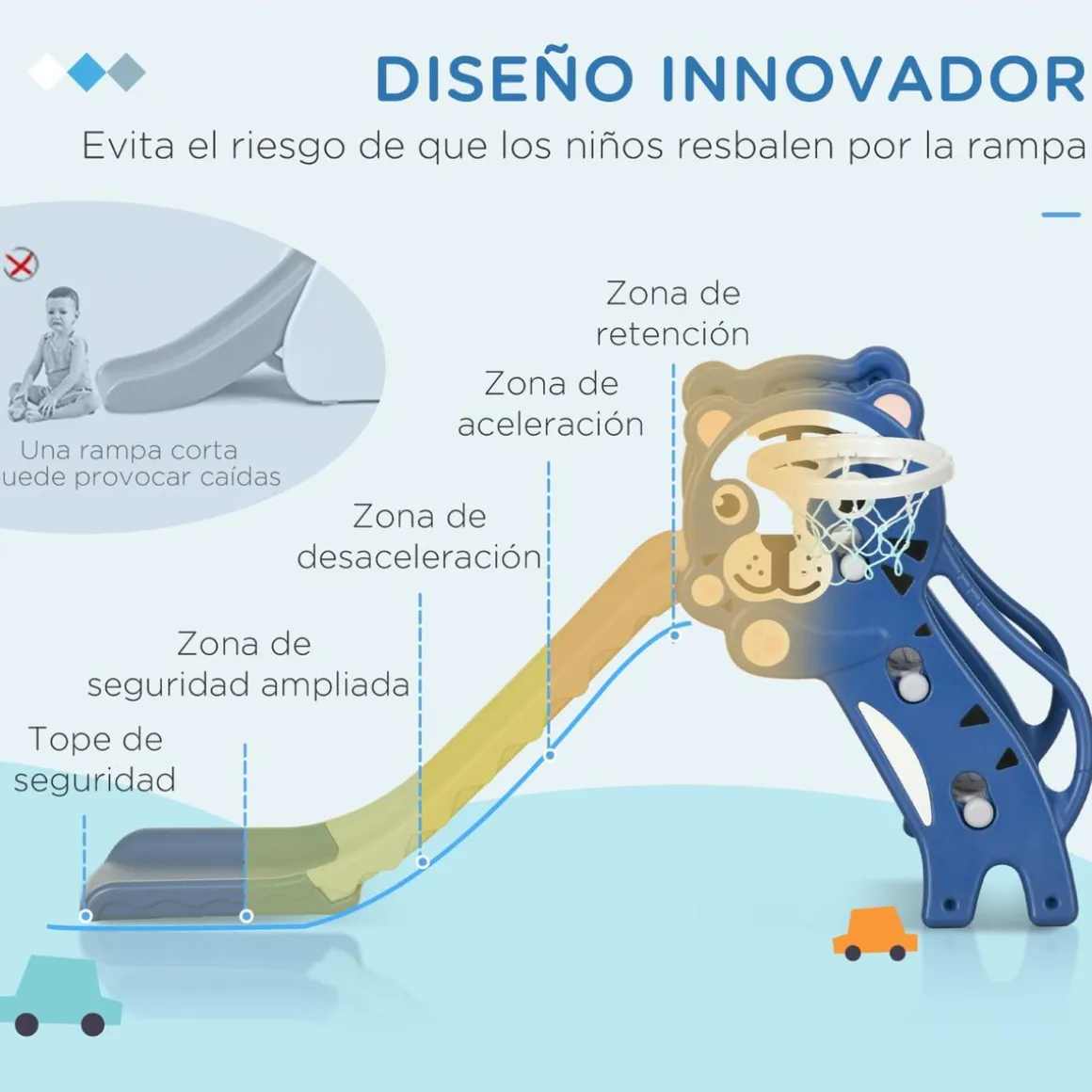 - Diseño 2 en 1. Este tobogán para niños incluye también un aro de baloncesto, y la pelota y el inflador para que los niños puedan jugar y pasárselo en grande nada más recibirlo.