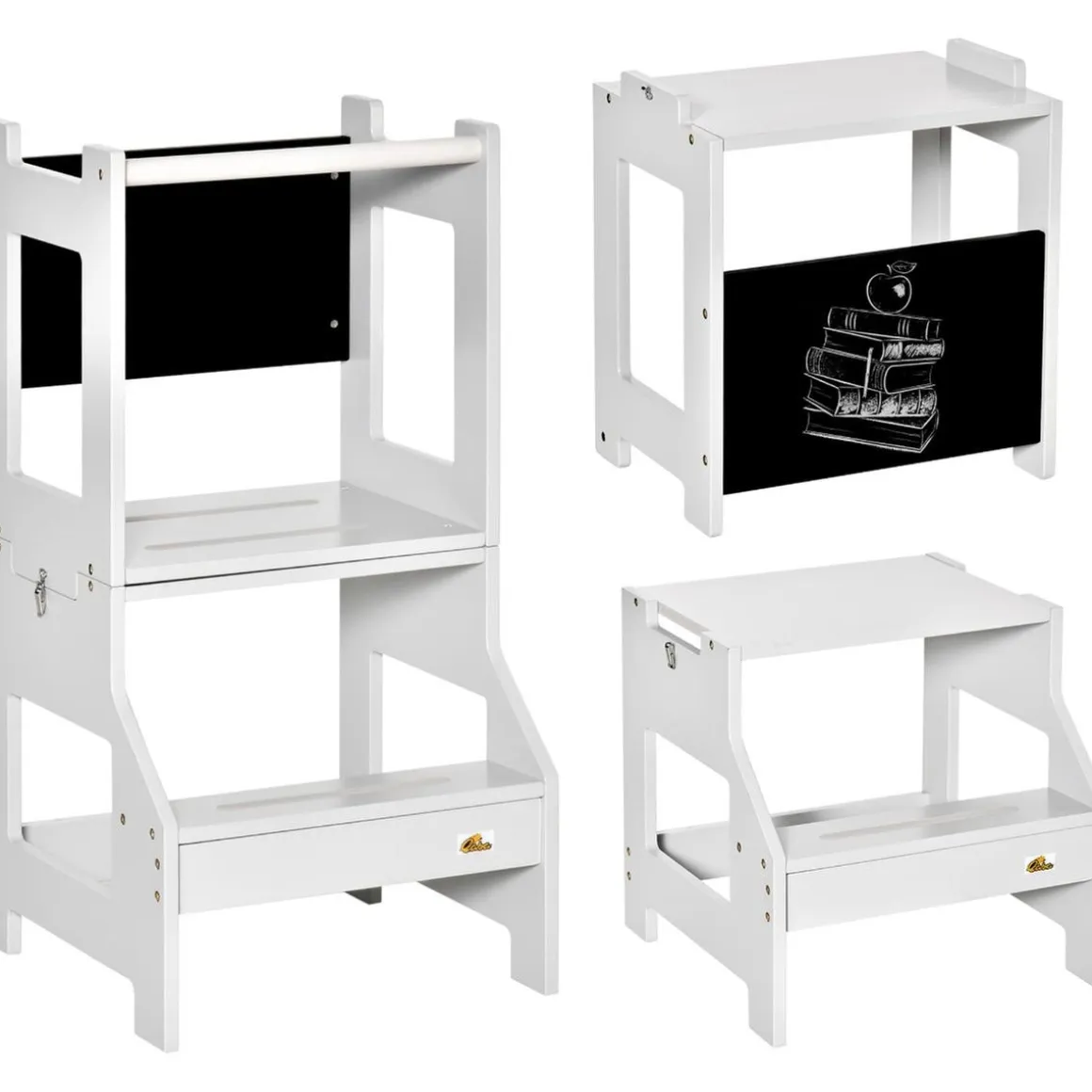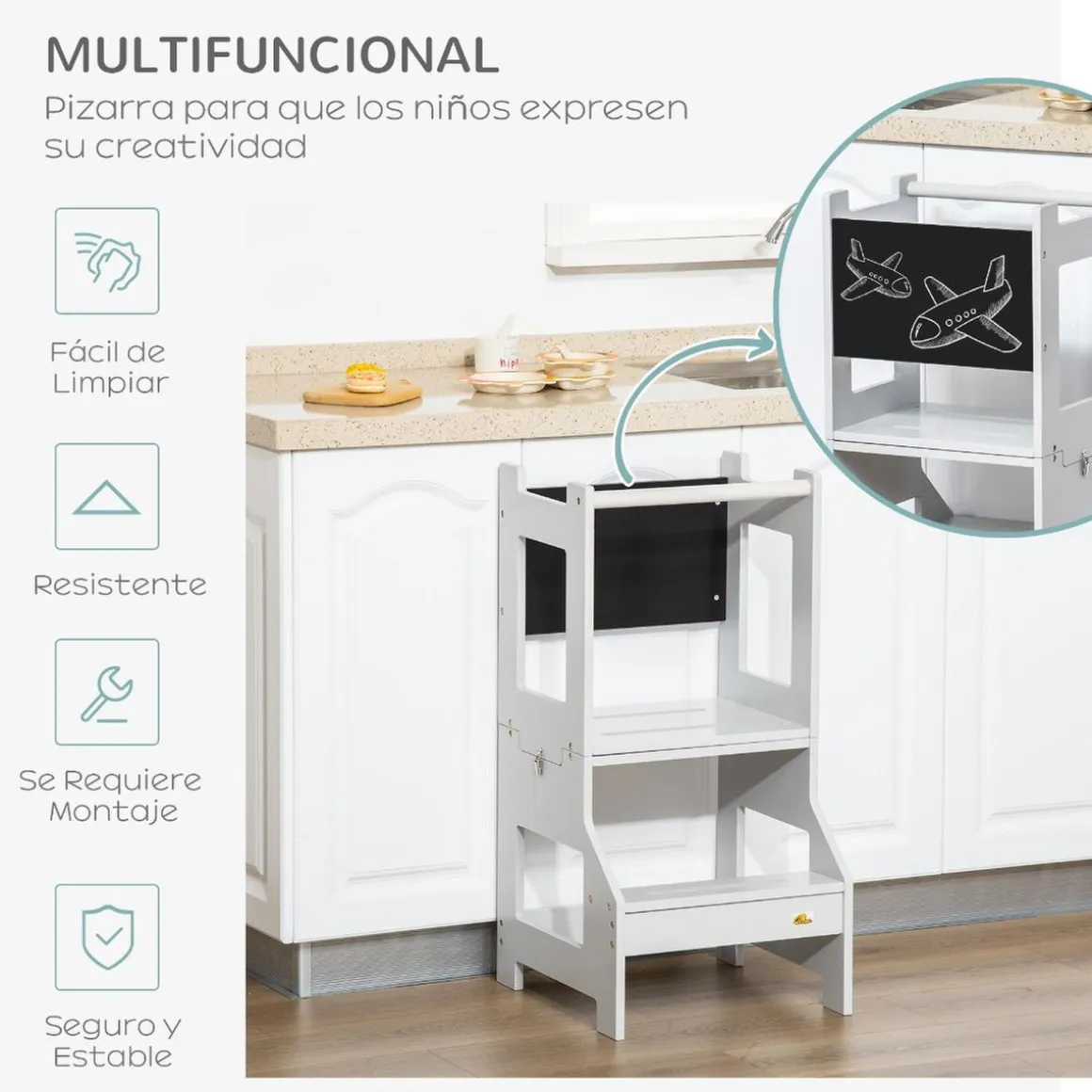 Fomenta la independencia de los peques con esta torre de aprendizaje. Fabricada en MDF con estructura trapezoidal, es segura y estable. Su diseño 2 en 1 permite convertirla rápidamente en una mesa y silla infantil, ideal para pintar o leer cuentos.