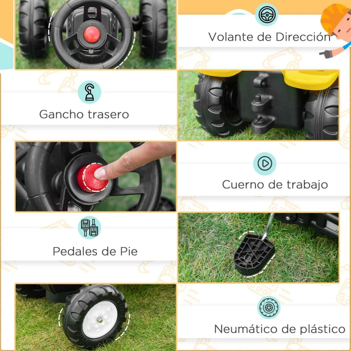 - Tractor a pedales para niños fabricado en plástico y estructura de metal resistente