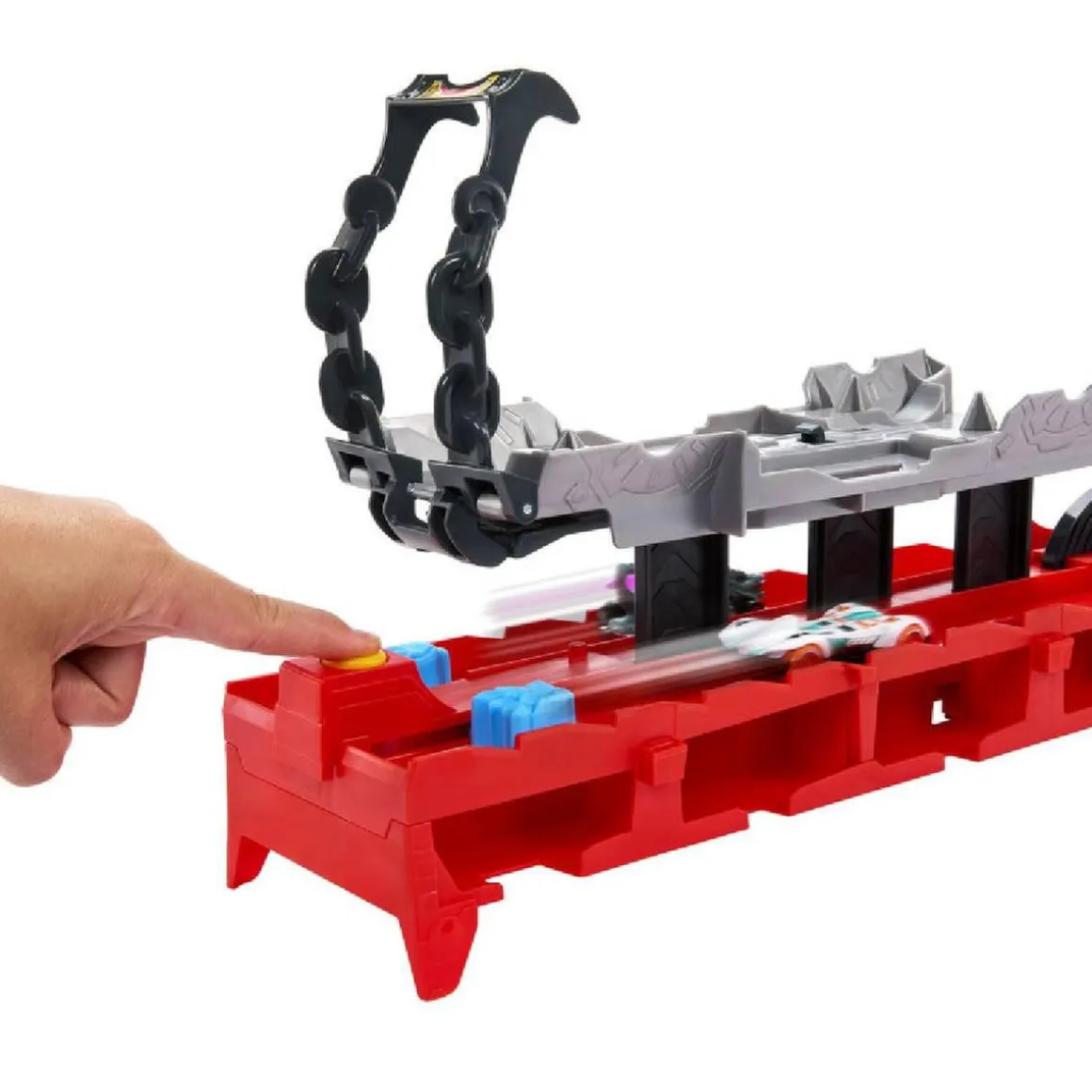 Pista de carreras transformable: solo pulsa el botón y observa cómo el dragón se lanza en picado, derribando los coches y aumentando la diversión.