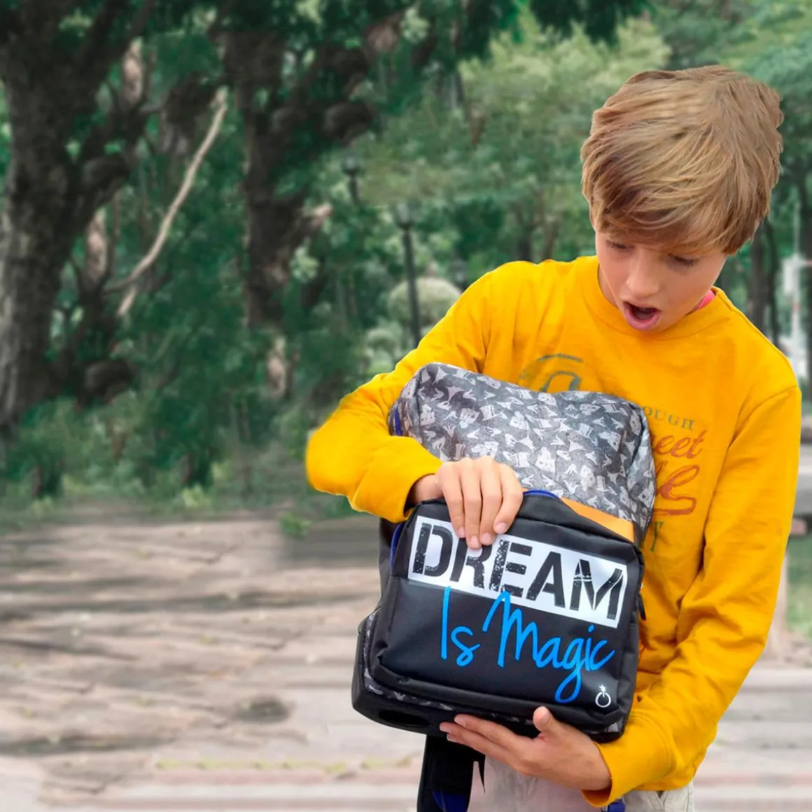 La mochila iMagicBox Street Edition tiene doble fondo en cuerpo principal y en bolsillo frontal, bandolera trucada, y truco de realidad aumentada en el bolsillo.