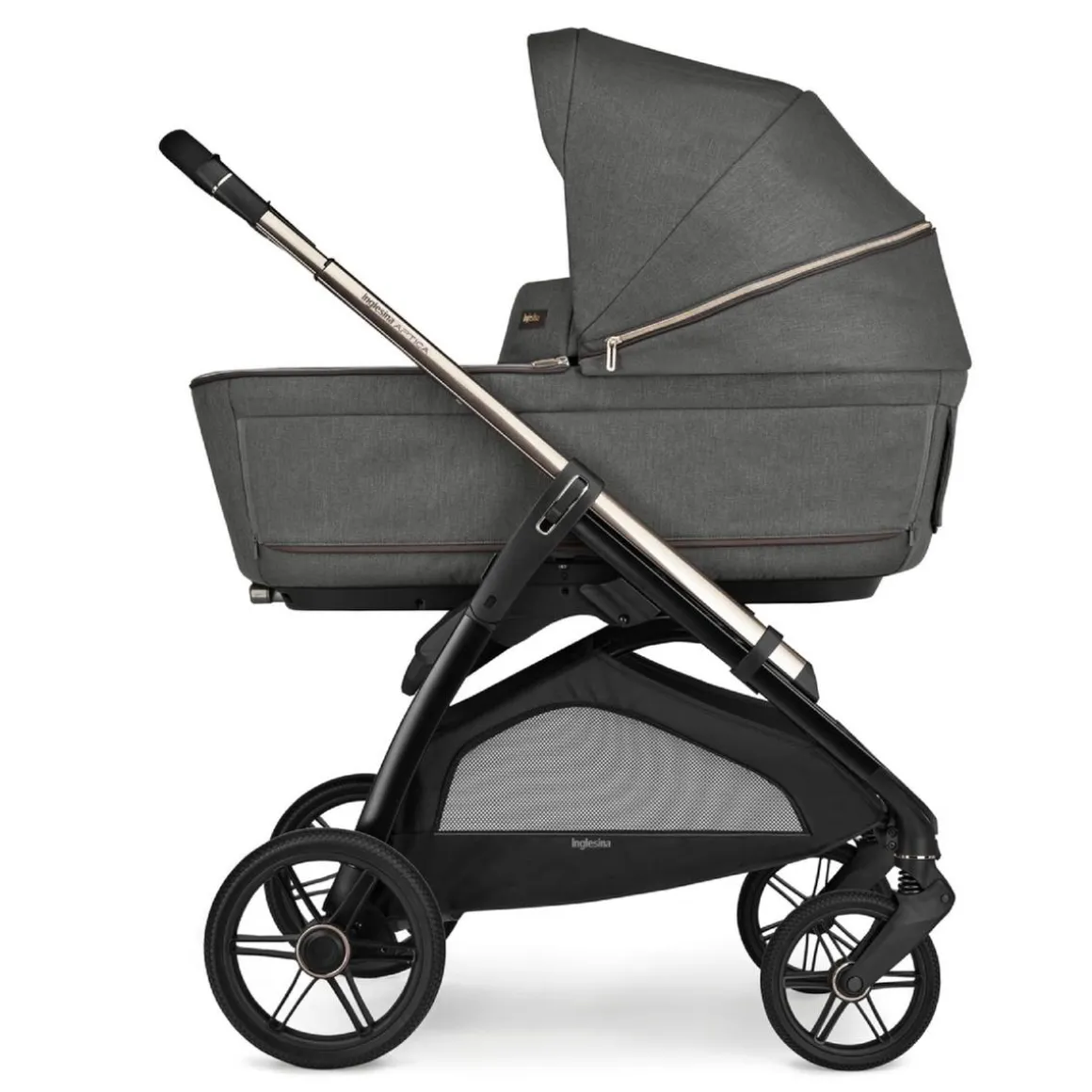 Inglesina – Trio Aptica Darwin recline + chasis Paladio – Velvet grey, combina estilo, confort y funcionalidad en un sistema modular System Quattro que incluye capazo, silla de paseo y silla de auto.