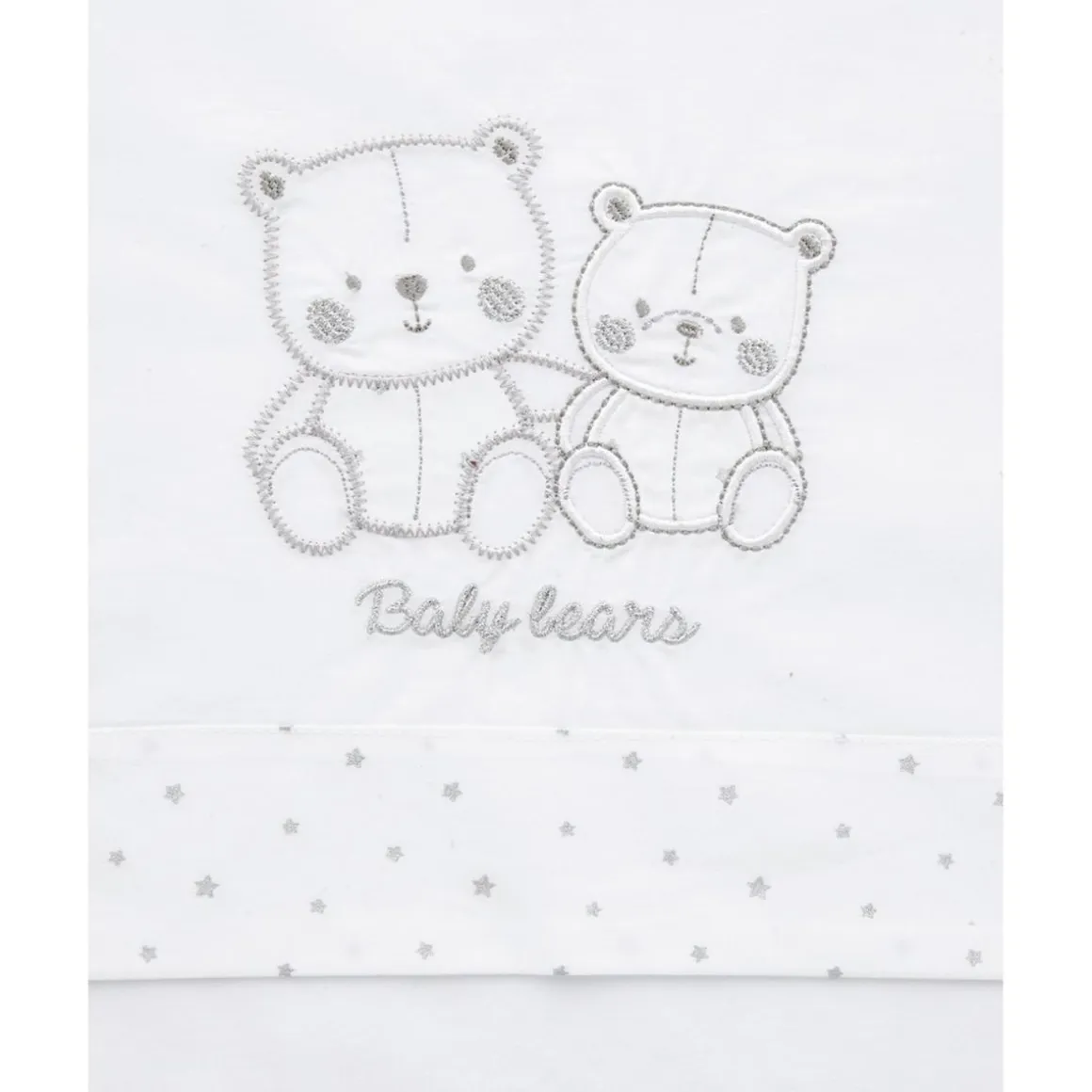 Este clásico juego de 3 piezas está confeccionado en algodón e incluye una sábana encimera blanca con bordes decorados con estrellitas plateadas brillantes y el bordado de dos ositos abrazándose junto a la inscripción «baby bears». La sábana bajera es de color blanco liso, mientras que la funda de almohada es blanca con un borde a tono decorado con estrellitas plateadas brillantes.