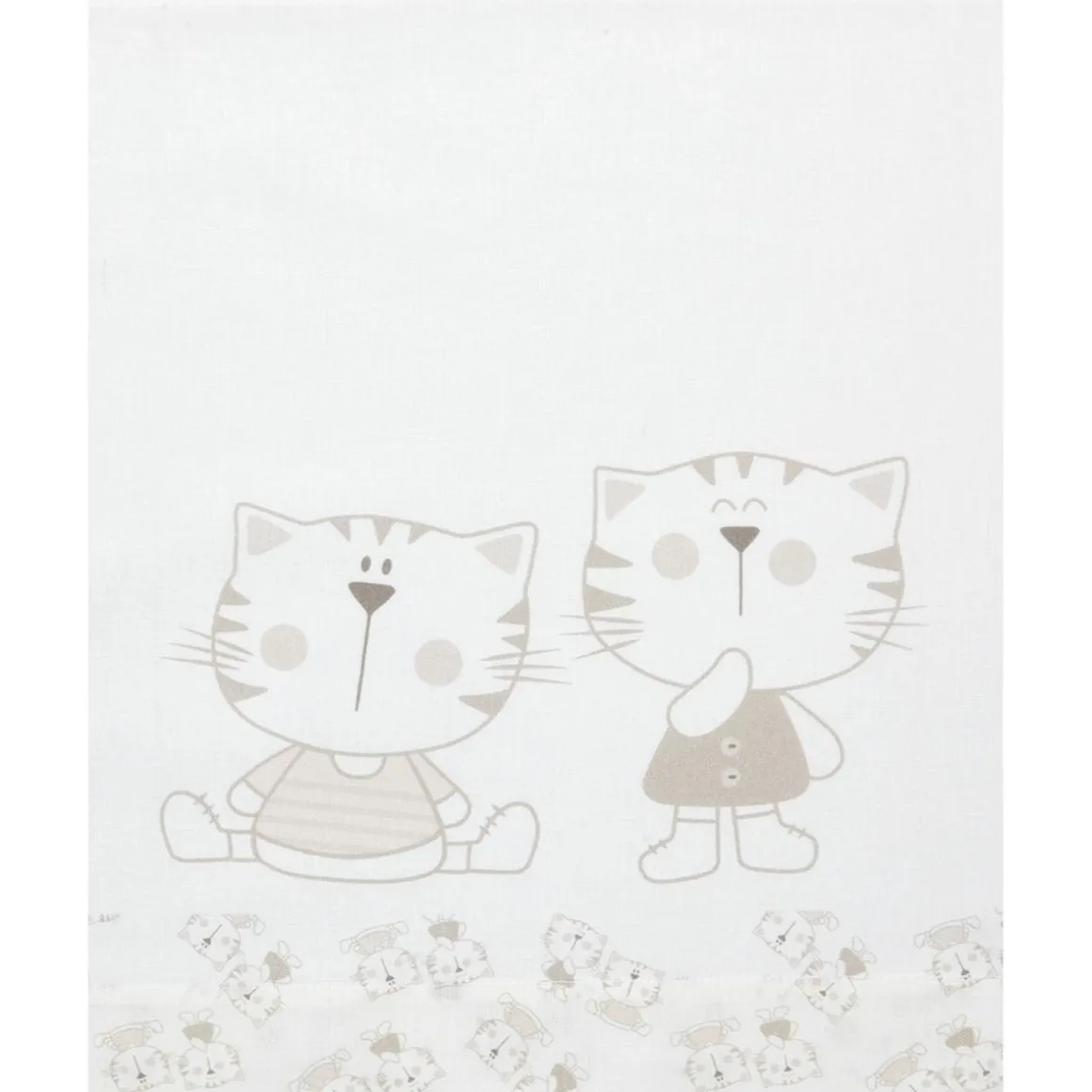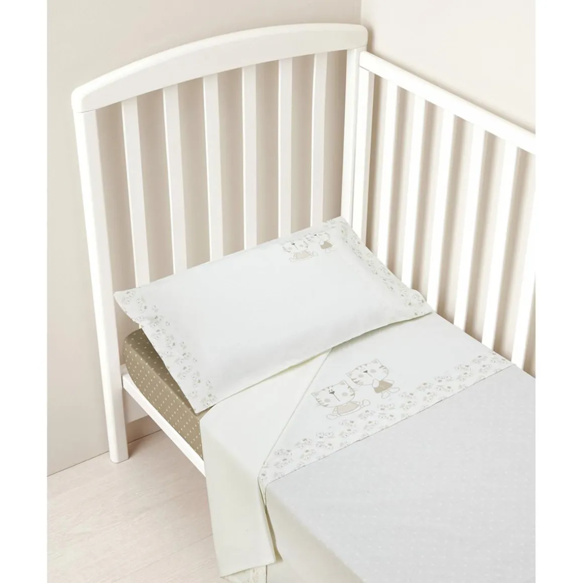 Este encantador juego de cama para cuna incluye una sábana encimera con divertidos animalitos estampados en el frente y un borde con el mismo diseño; una funda de almohada con bordes estampados en todo su contorno y una sábana bajera ajustable con un patrón de lunares beige.