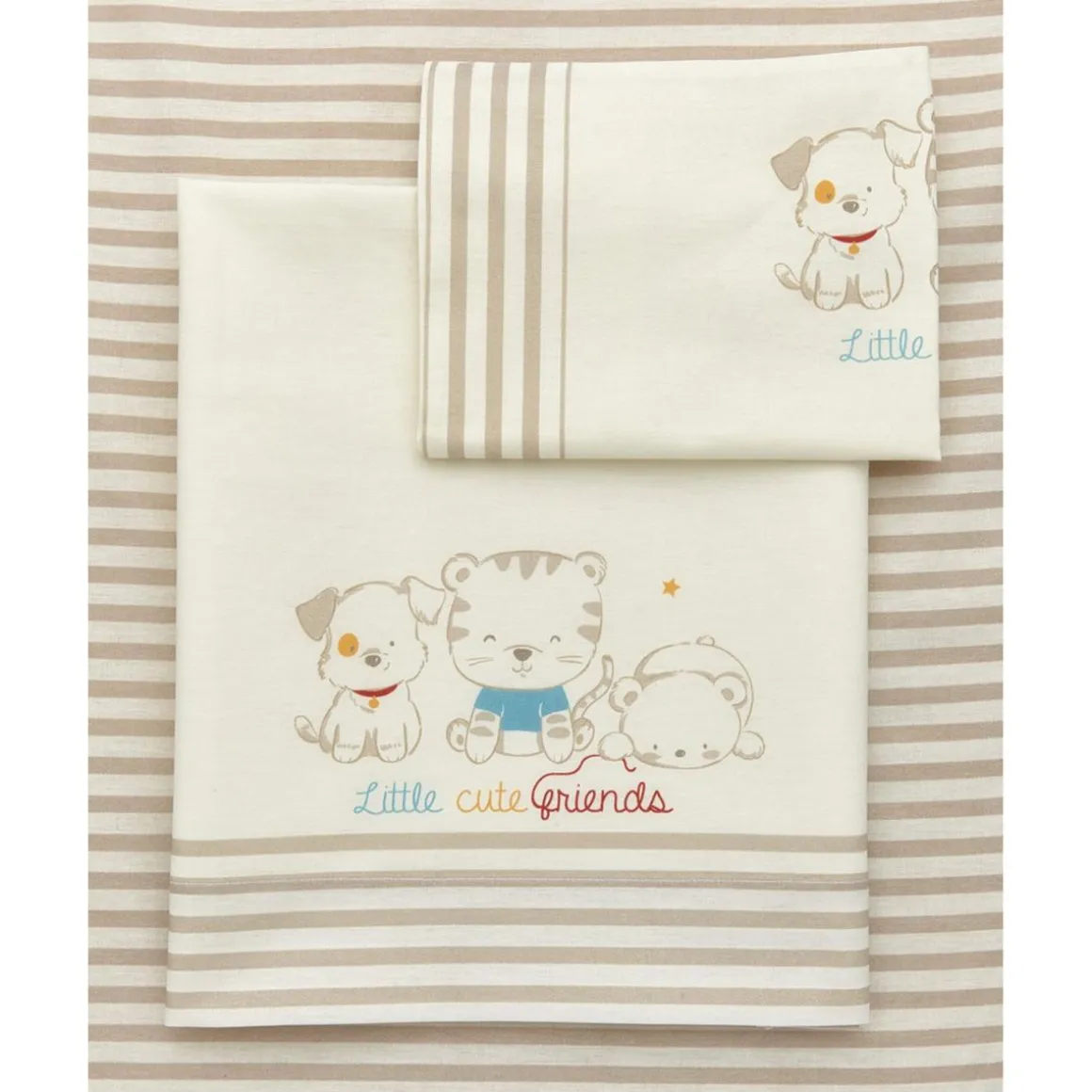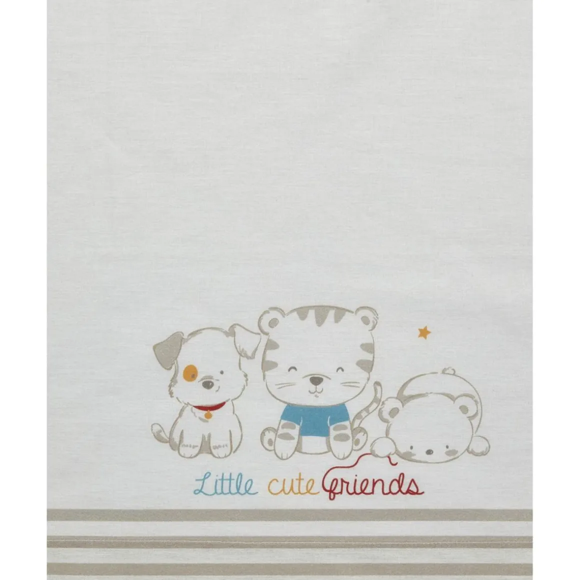 Este práctico juego para cuna o cochecito de algodón consta de una sábana encimera con la impresión de tres simpáticos animalitos en el frente y un borde con estampado de rayas finas; una funda de almohada con bordes estampados a juego y una sábana bajera sin esquinas.