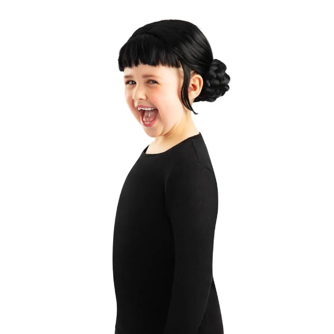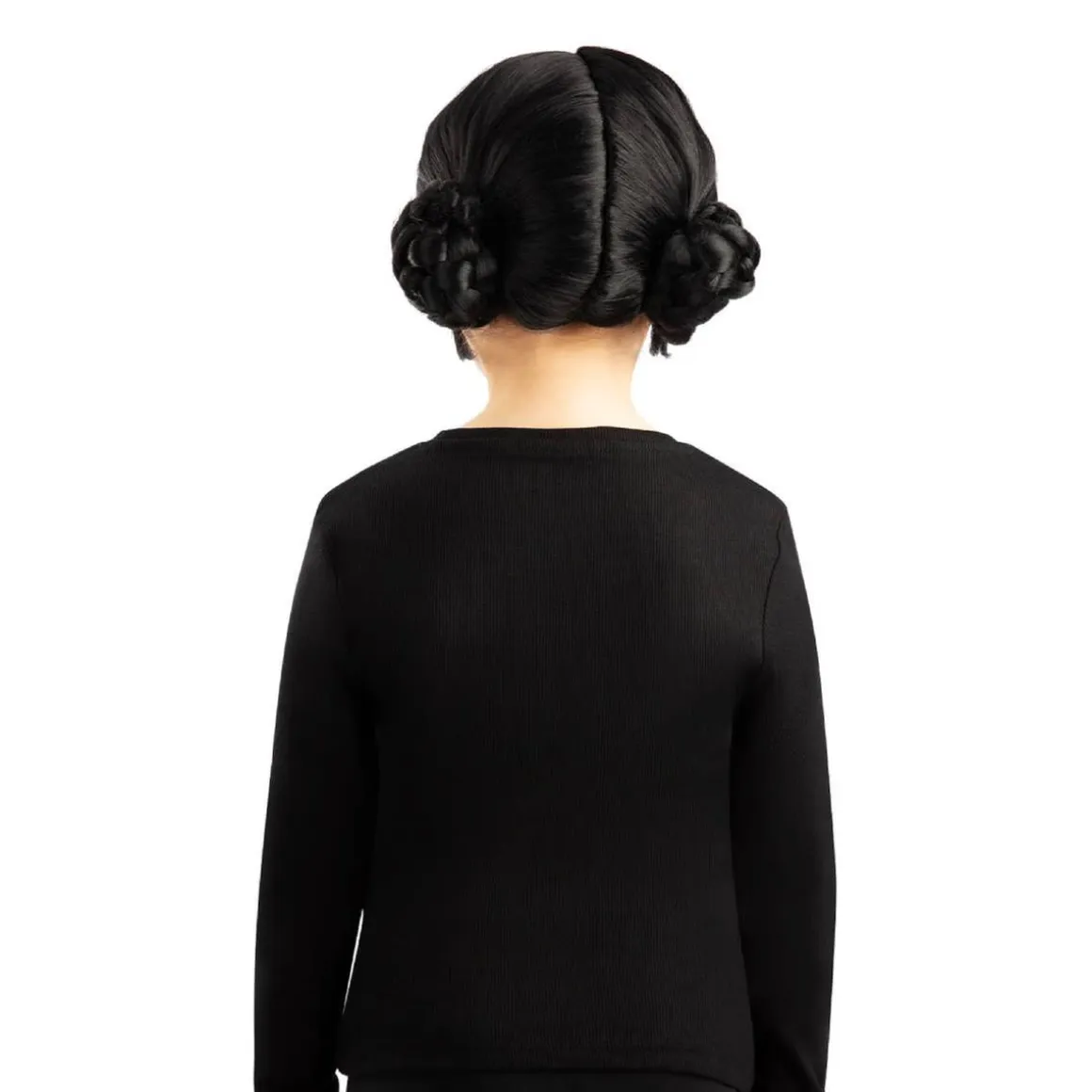 - Peluca de pelo sintético negro con raya central.