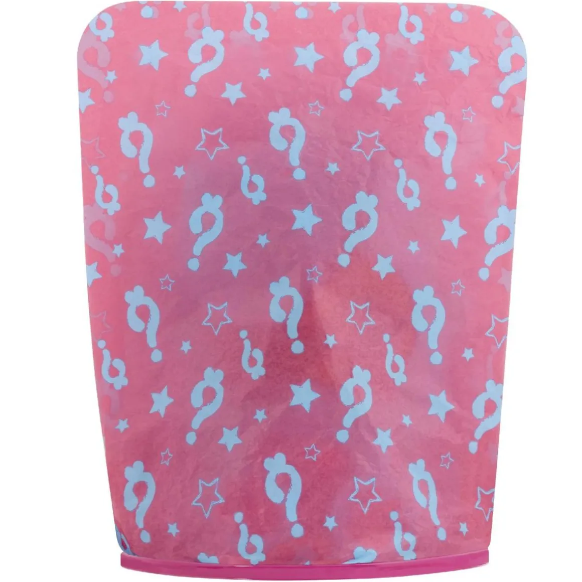 Descubre lo que hay dentro del paquete rasgando primero la cremallera en la parte inferior y levantando la cubierta exterior rosa para revelar un papel de regalo misterioso, dando inicio a la primera etapa del proceso de inflado.