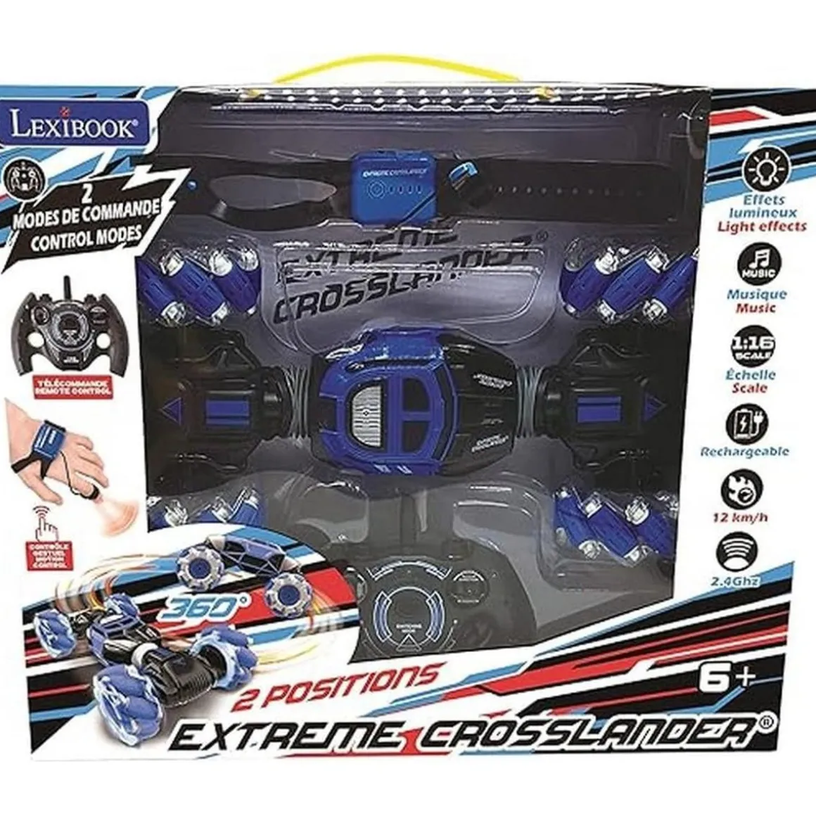 El Extreme Crosslander ofrece dos modos de control: el clásico con mando a distancia y el revolucionario sistema de control por gestos. La pulsera incorpora un sensor de movimiento que permite guiar al coche hacia adelante, atrás y a los lados, con la simple inclinación de la mano. Cambiar entre estas opciones es sencillo y proporciona una experiencia de juego completa y variada.