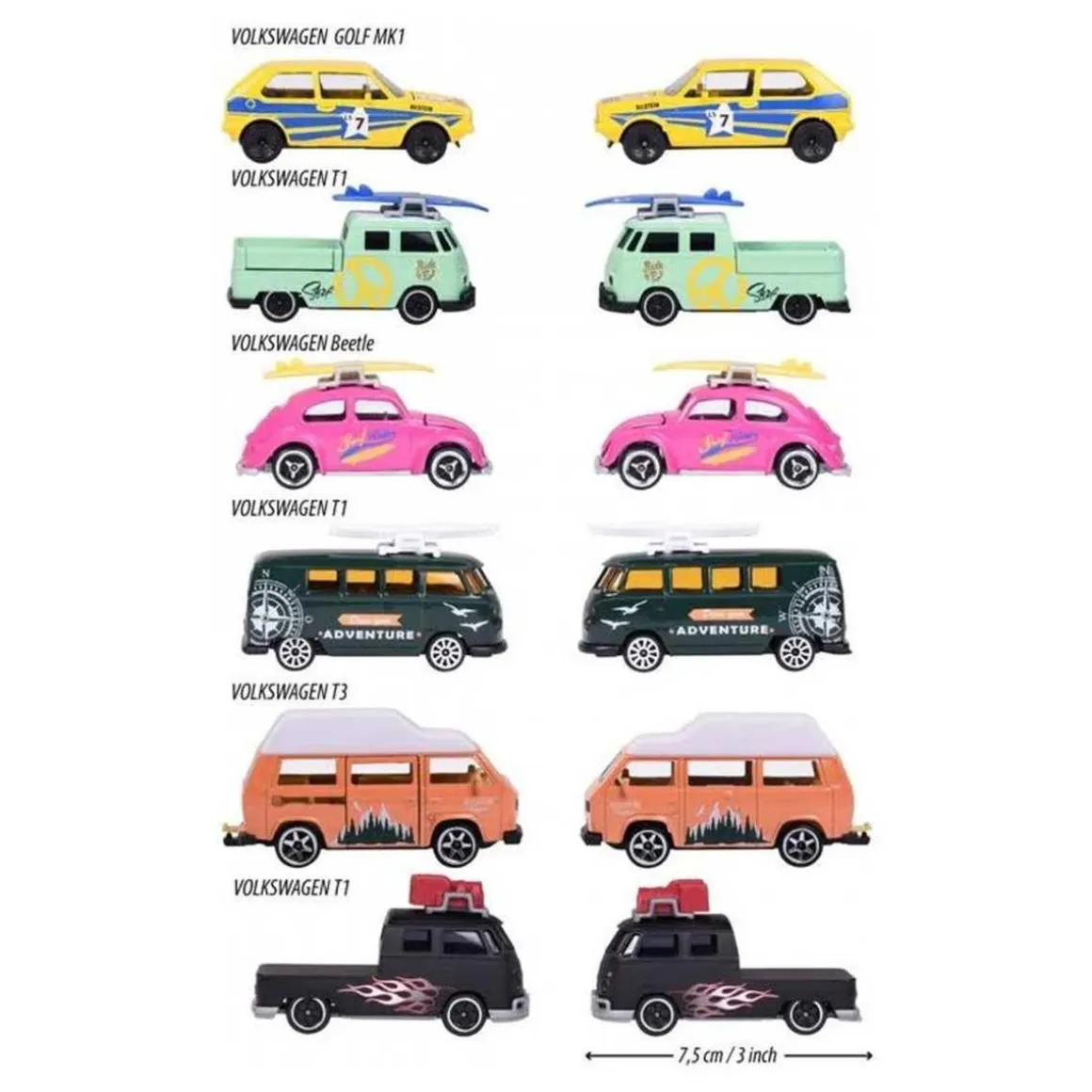 Estos coches de juguete Majorette no solamente son adecuados para los niños, sino también para los apasionados de la marca y coleccionistas de modelos de vehículos. Cada vehículo viene con una tarjeta de coleccionista, lo que lo convierte en un regalo perfecto para todos los fans de VW.