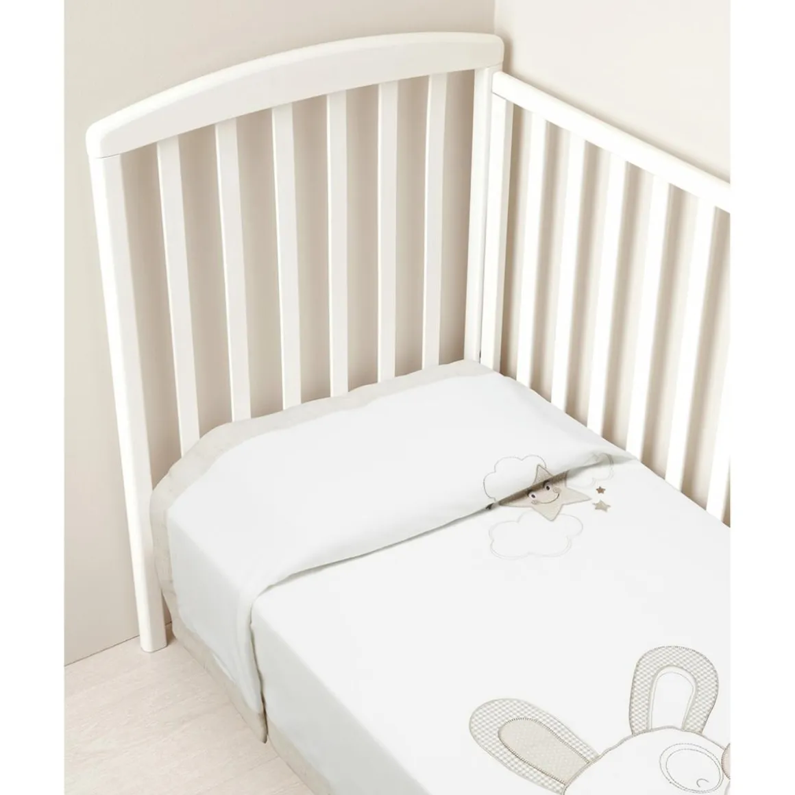 Esta cálida manta de cuna está confeccionada en suave algodón con detalles en lino, proporcionando abrigo y confort al bebé.