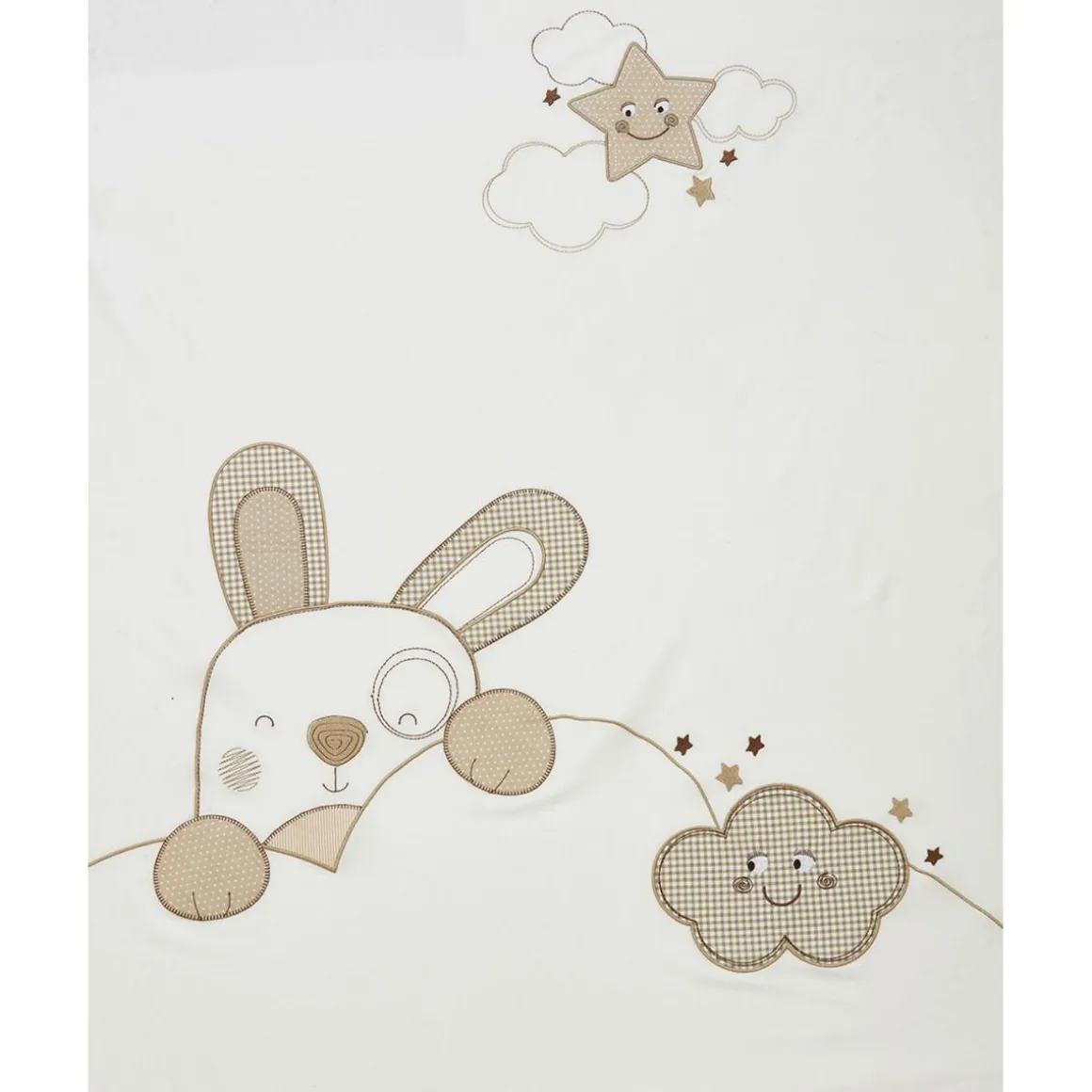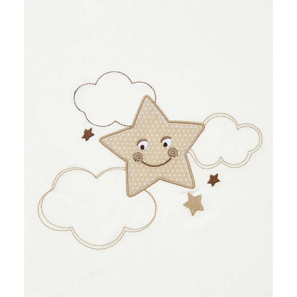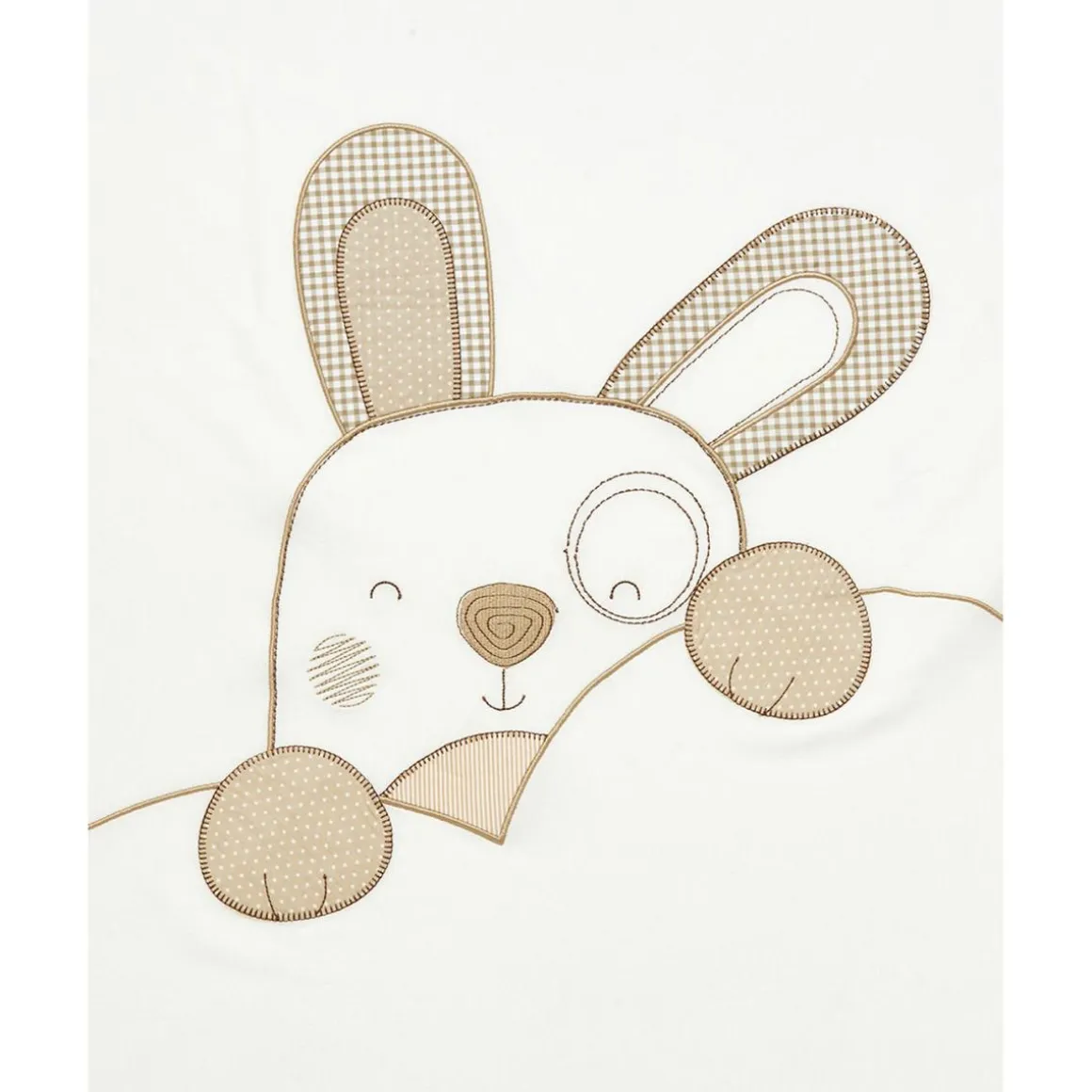 De color blanco, luce un adorable bordado de perrito en tonos beige con detalles en patchwork. Un elegante borde de lino beige completa el diseño.