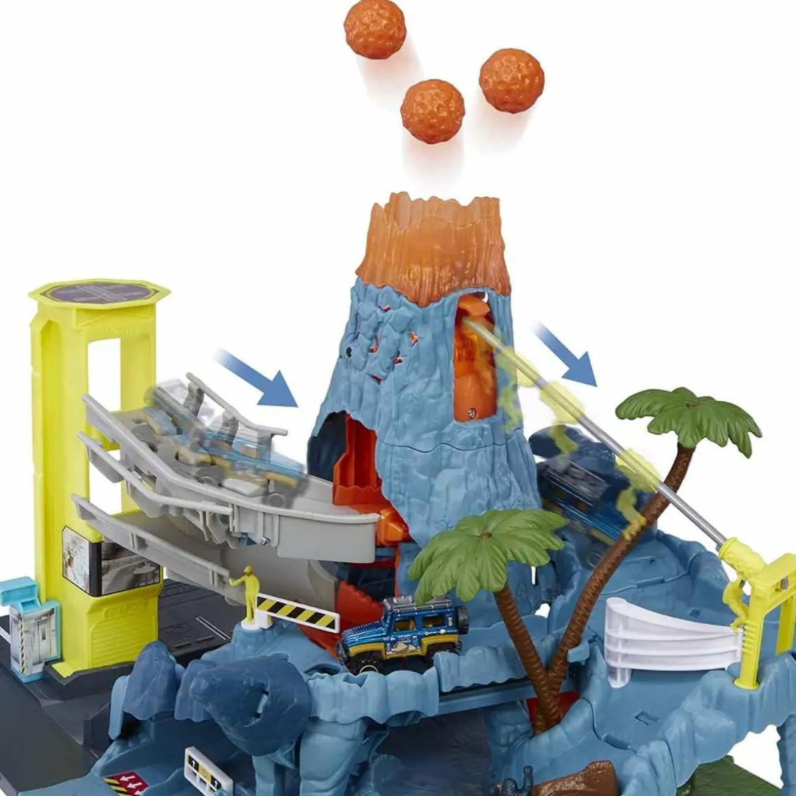 Activa el ascensor para llevar los coches a la cima del volcán, donde encontrarán una serie de obstáculos mientras conducen hacia un lugar seguro.