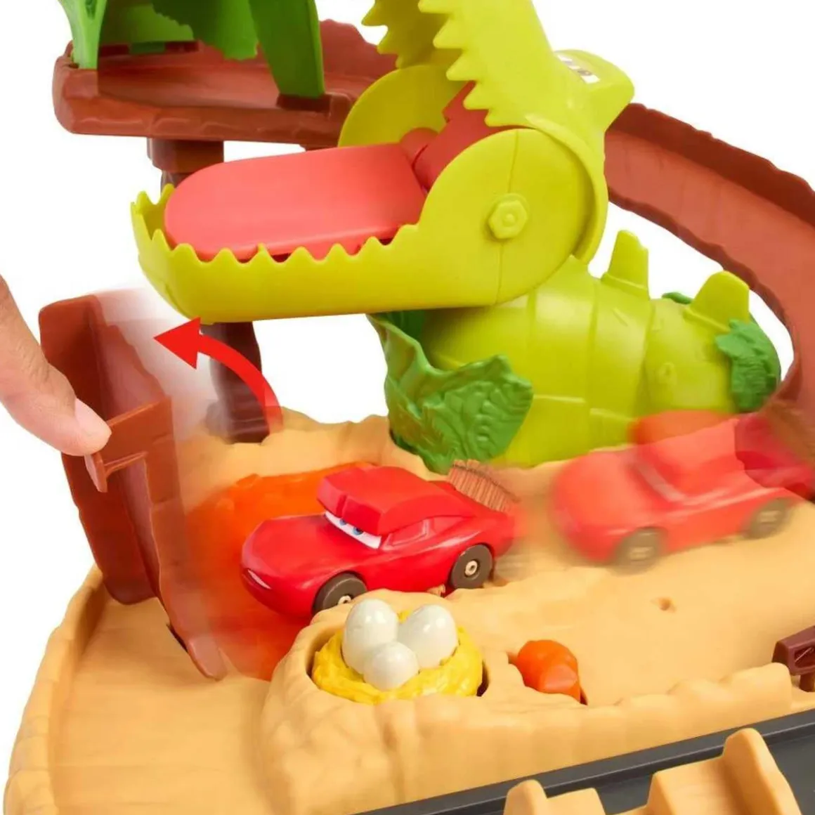 En este emocionante desafío, los niños deben usar el lanzador para hacer que sus vehículos salten sobre un campo de lava y lleguen a la pista evitando las temibles mandíbulas del dinosaurio. Una vez que lo logren, se enfrentarán a nuevas aventuras deslizándose por el acantilado, donde pueden encontrar huevos de dinosaurio escondidos o caer en un pozo misterioso.