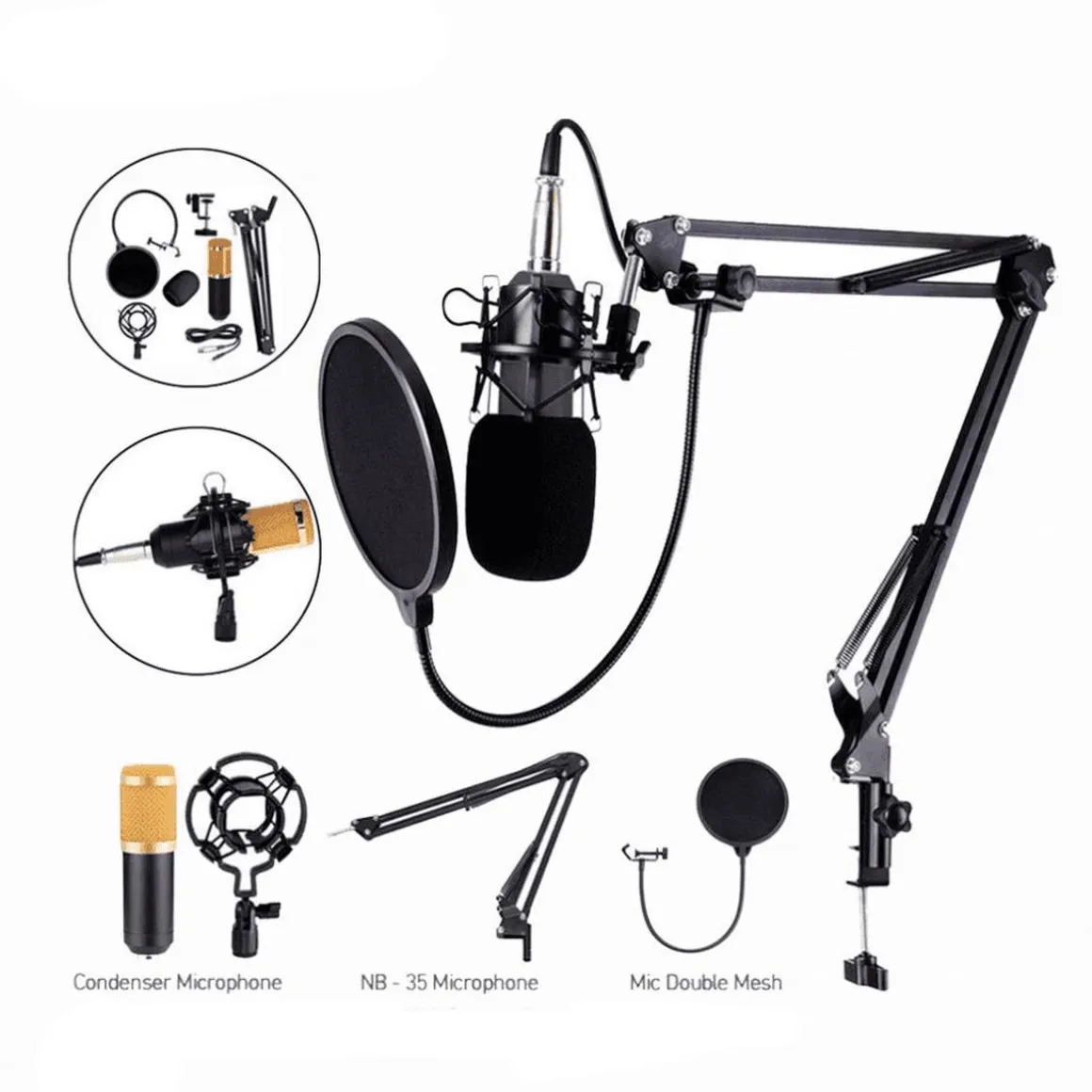 - Incluye un micrófono BM-800, amortiguador, filtro de ruido, montaje de micrófono ajustable, soporte de brazo, parabrisas, cable de alimentación y tarjeta de sonido.