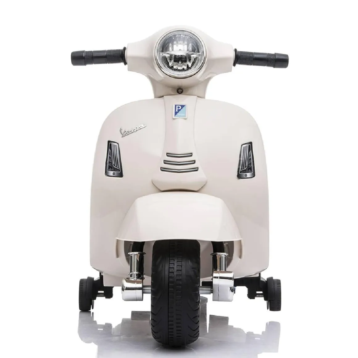 Mini Vespa blanca 6V, una mini moto eléctrica con licencia Vespa muy fácil de utilizar mediante pedal de pie y manillar.