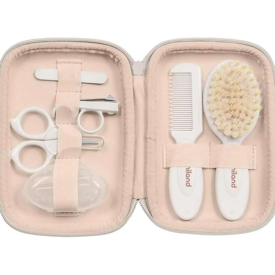Con el «Miniland – Neceser Cuidado Infantil Valencia», tener organizados todos los accesorios esenciales para el cuidado y la higiene de tu bebé nunca fue tan fácil. En su interior encontrarás un conjunto de herramientas especialmente pensadas para los más pequeños, incluyendo unas tijeras para las uñas con punta redondeada, un par de limas suaves para no dañar la delicada piel del bebé, y una variedad de cepillos para mantenerlo siempre limpio y arreglado. La resistente y práctica bolsa no solo cuida de la higiene al ser impermeable sino que su diseño también permite que todo esté al alcance de la mano en cada momento de uso.