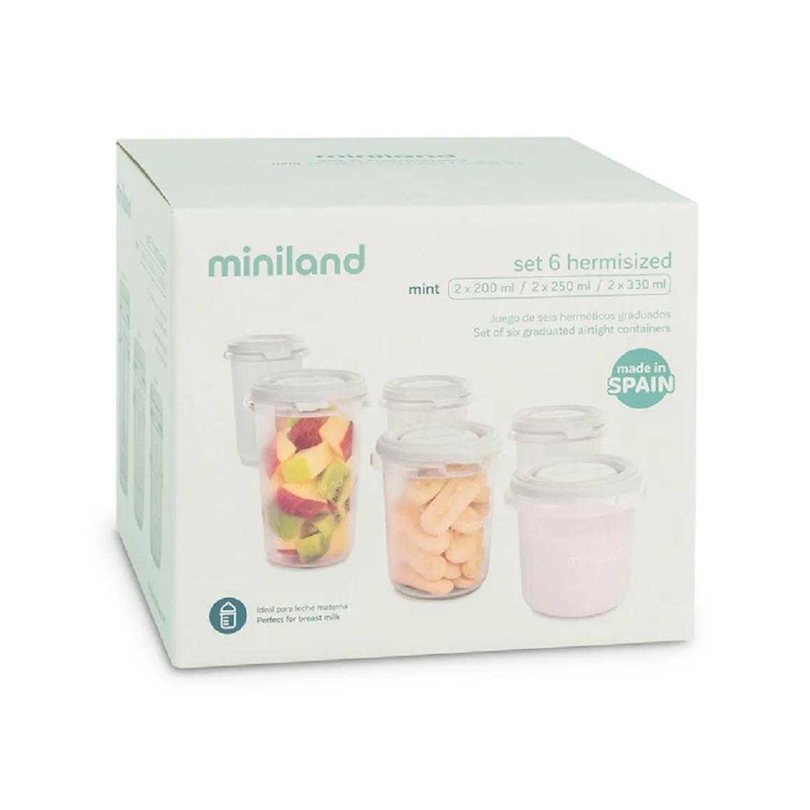 Miniland – Set de 6 recipientes herméticos menta, es la solución perfecta para almacenar, transportar y conservar los alimentos de tu pequeño, ya sean sólidos o líquidos.