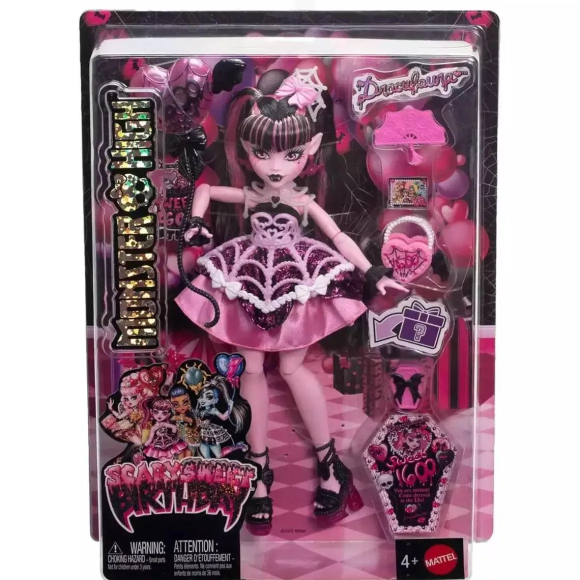 ¡Prepárate para una celebración monstruosamente elegante! Celebra el 1600º cumpleaños de Draculaura con esta muñeca exclusiva de la Colección Scary Sweet Birthday de Monster High. Con un estilo vampírico único y lleno de glamour, Draculaura se viste para impresionar y conquistar todas las fiestas monstruosas.