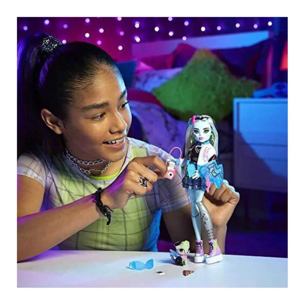 Monster High – Muñeca Frankie Stein, la muñeca Monster High de Frankie Stein con su conjunto azul eléctrico, accesorios y mascota.