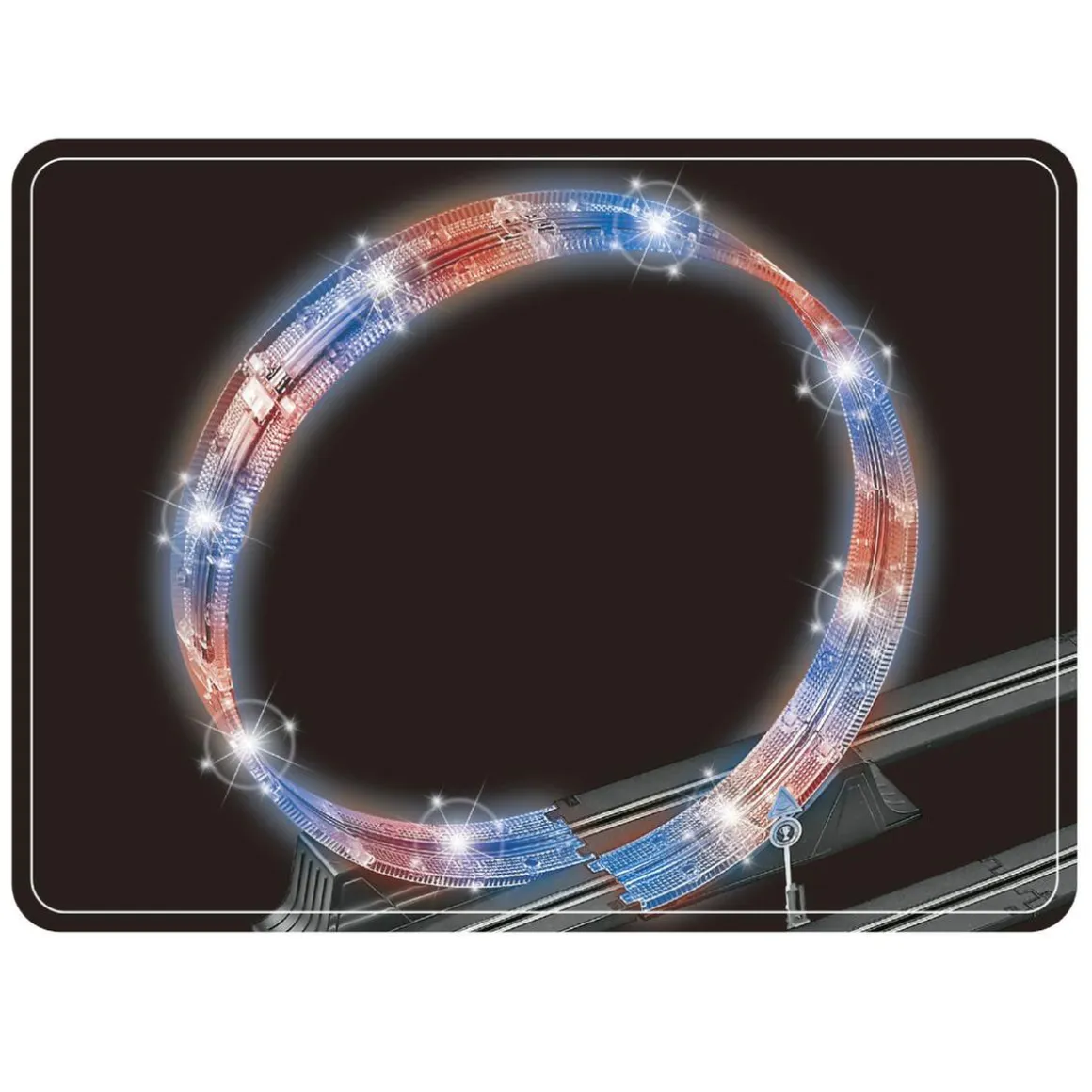 Equipada con dos coches luminosos a escala 1:43 y mandos a distancia con forma de volante, ofrece una experiencia de conducción totalmente inmersiva.