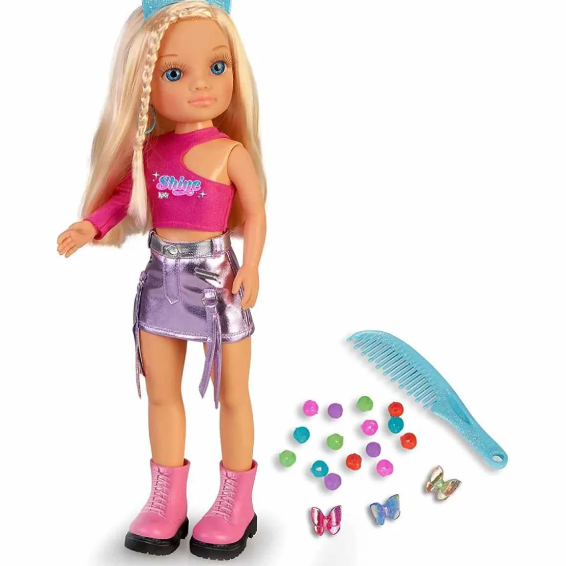 Nancy – Hair Colour Challenge, una muñeca Nancy súper moderna que siempre sigue las tendencias y va a la moda, por eso ahora se cambia el color de su melena larga y lleva una diadema con orejas de gato.
