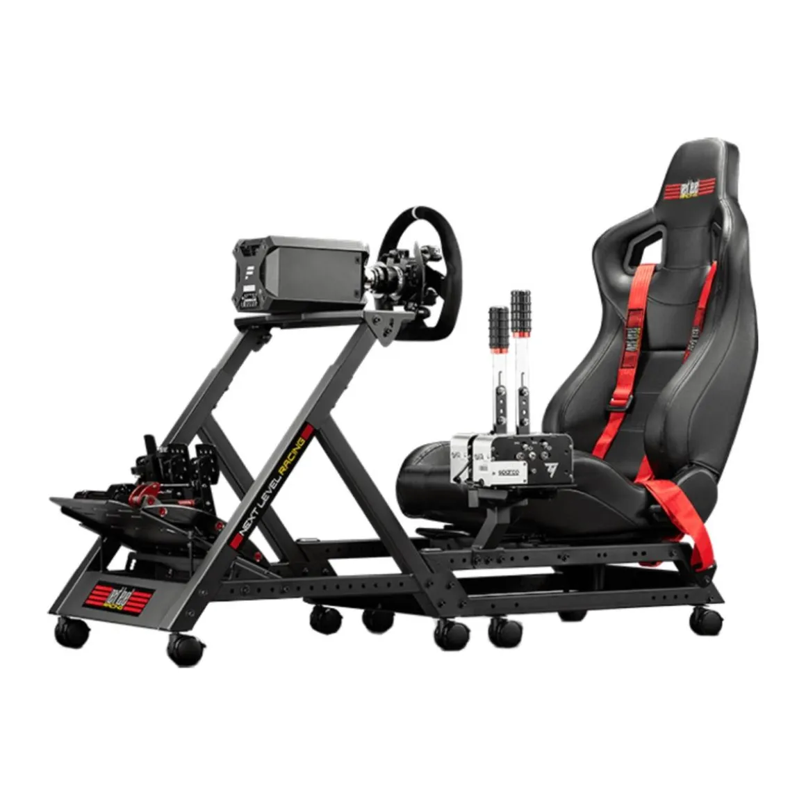 Está equipado con un soporte para el cambio de marchas y el freno de mano, un adaptador Buttkicker, un arnés de carreras de cuatro puntos, ruedas giratorias bloqueables y patas ajustables de altura.