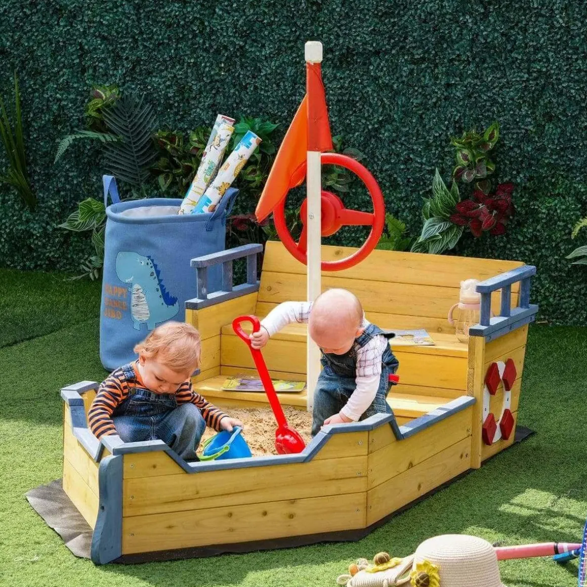 - La caja de arena con forma de barco tiene un asiento amplio y estable para los niños.