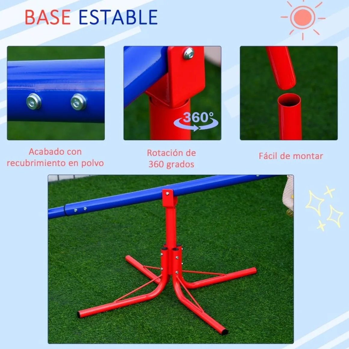 – Base robusta y ancha de cuatro varillas para mayor estabilidad y seguridad durante el tiempo de juego