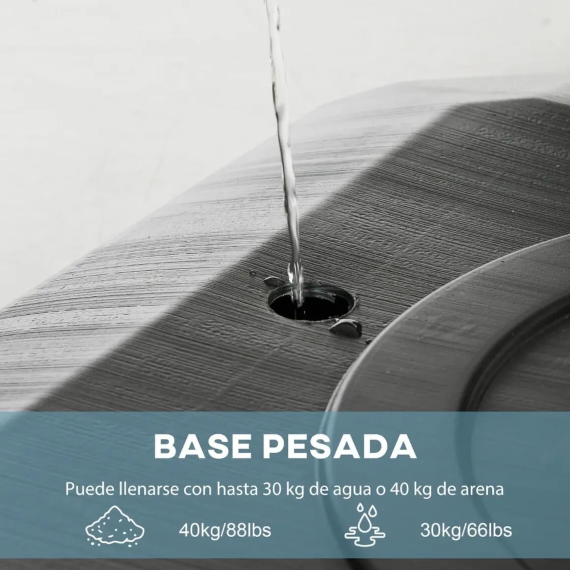 - La base se puede llenar con arena o agua para mayor estabilidad.