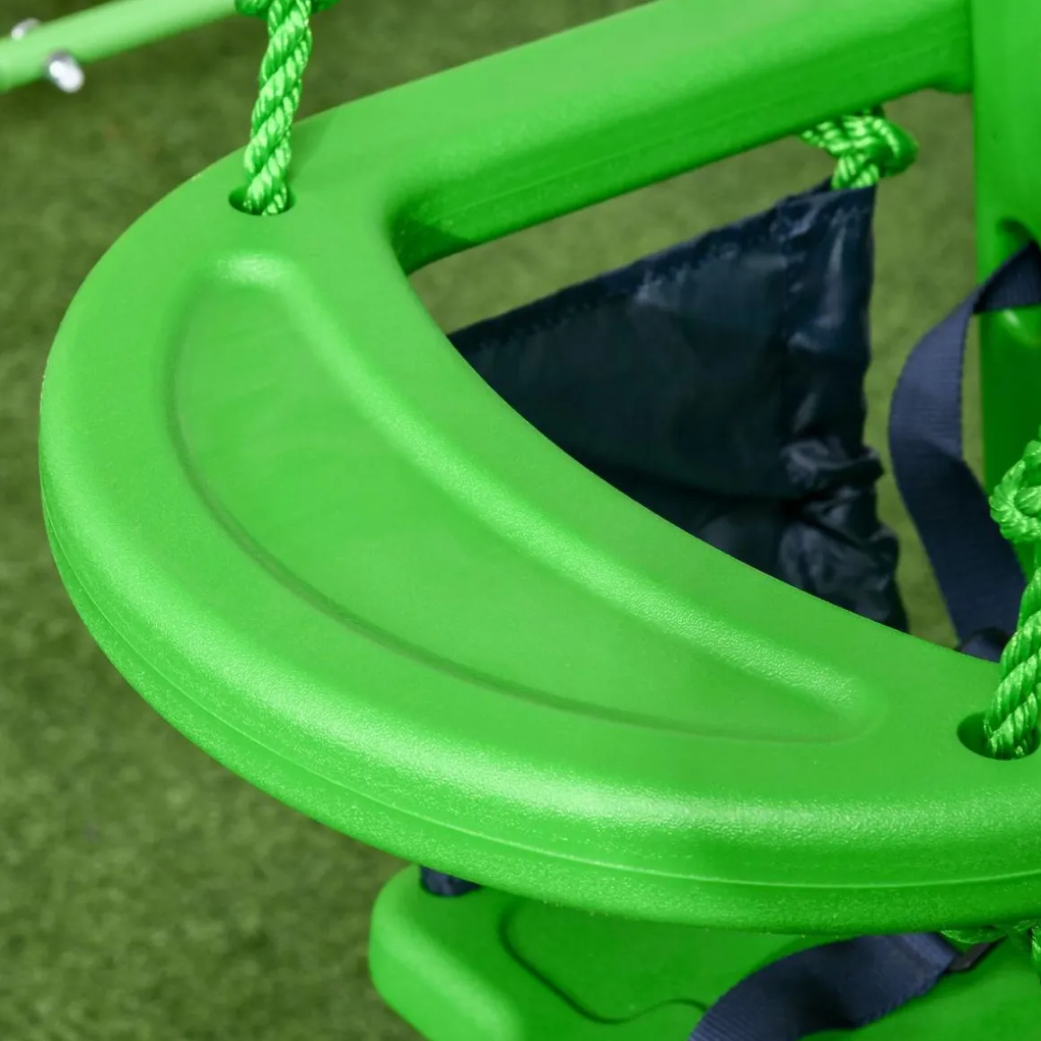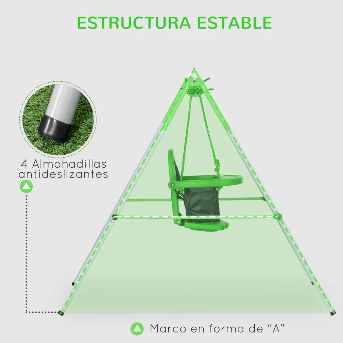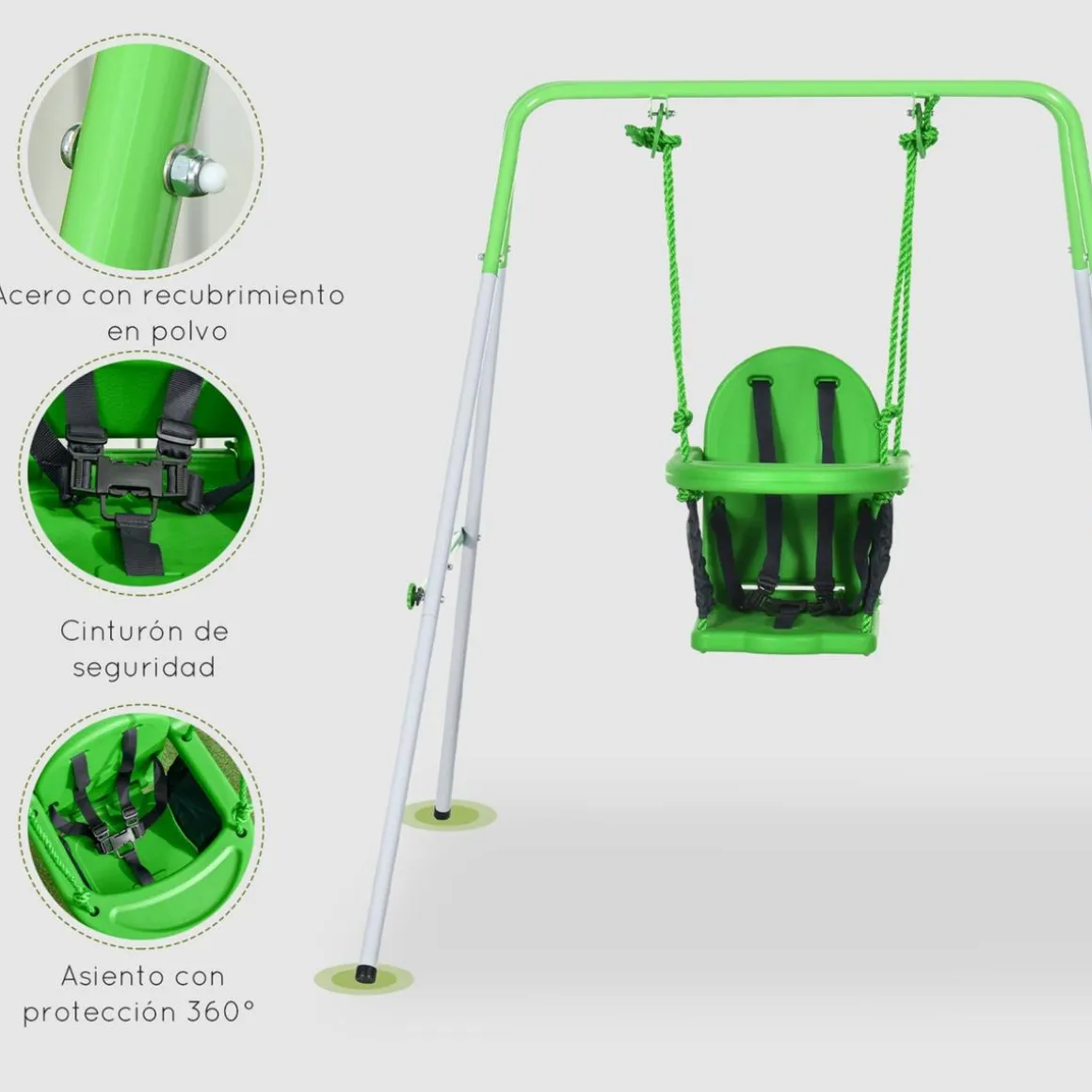 Además, pensando en garantizar siempre la seguridad de nuestros usuarios, y sobre todo si son niños, este columpio tiene laterales y respaldo altos, barra delantera y arnés de seguridad para evitar cualquier caída accidental.